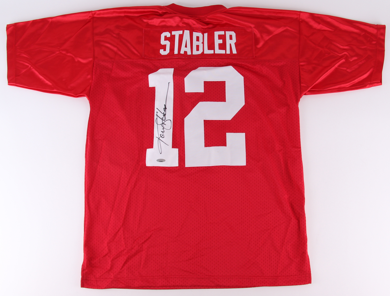 Custom on-field style jersey. Everything is sewn on, size XL. Hand-signed in black felt-tip pen by Ken Stabler (Raiders, HOF, D.2015).