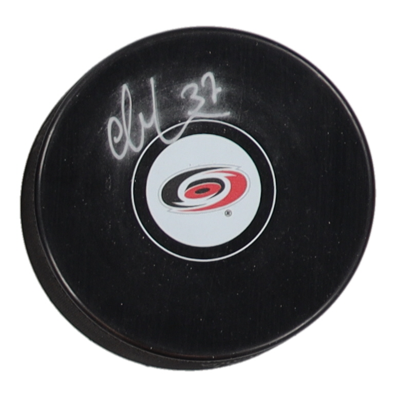 Carolina Hurricanes logo hockey puck. Hand-signed by Andrei Svechnikov.