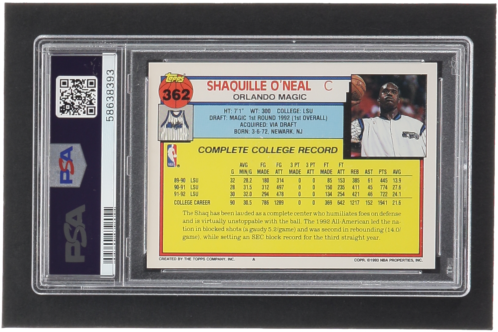 Shaquille O'Neal 1992-93 Topps #362 RC (PSA 9)