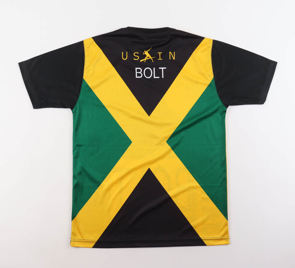 Custom jersey with everything printed on, size M. Hand-signed by Usain Bolt.