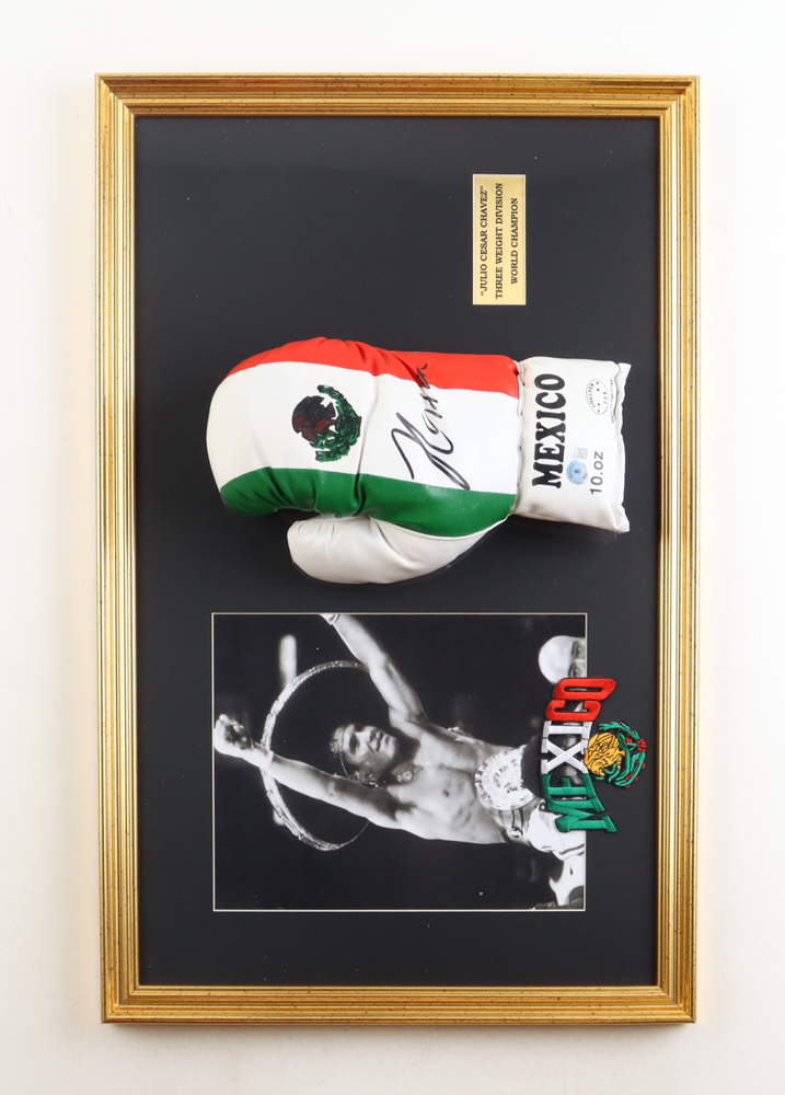 Custom frame measures 15" x 25" in size and features an Everlast boxing glove that has been hand-signed by Julio Cesar Chavez (HOF).