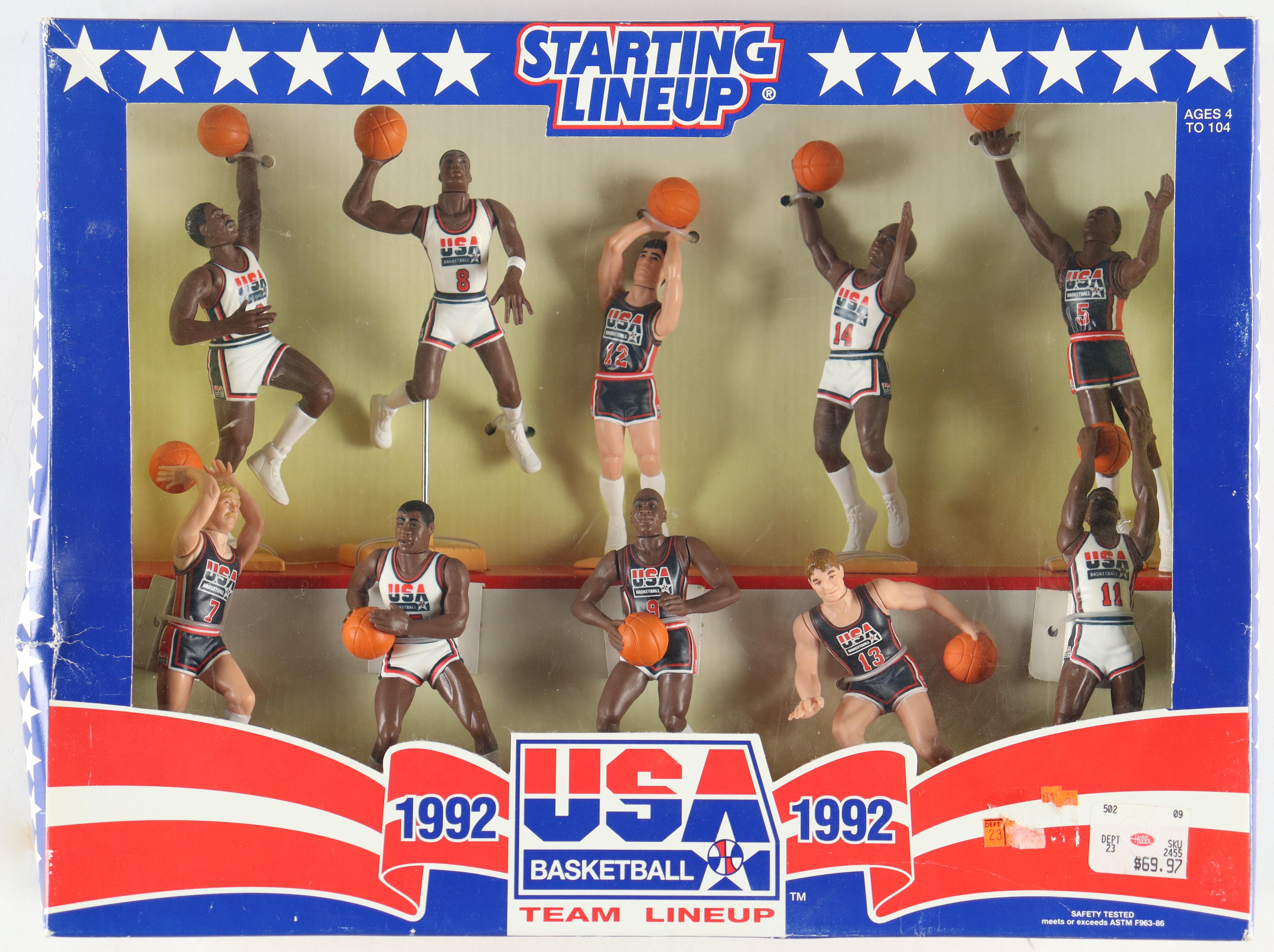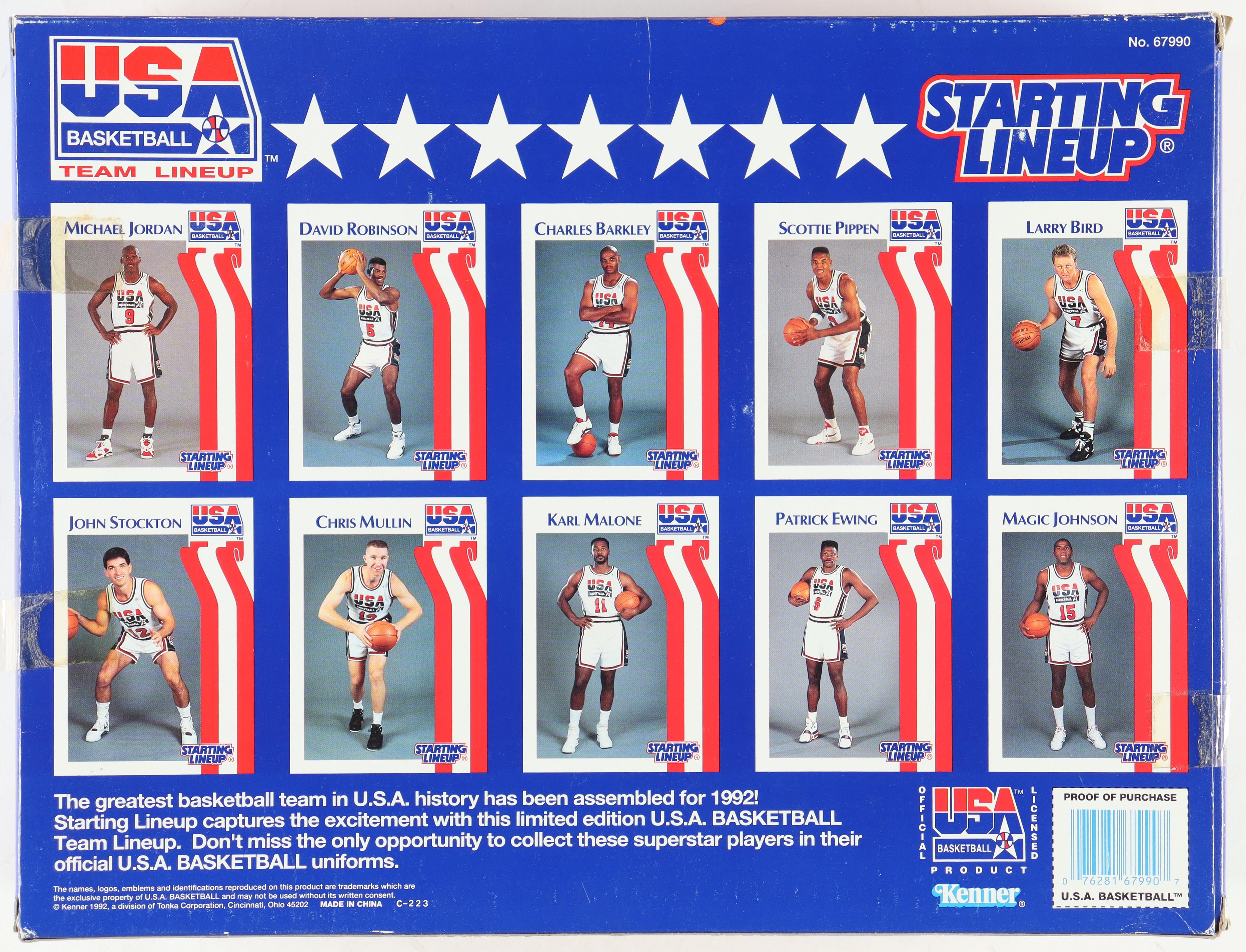 1992 Starting Lineup Team "Dream Team" USA Basketball Players Action Figure Set. Please note, the original packaging has creasing, scuffing and corner wear. The action figure set is unsigned.