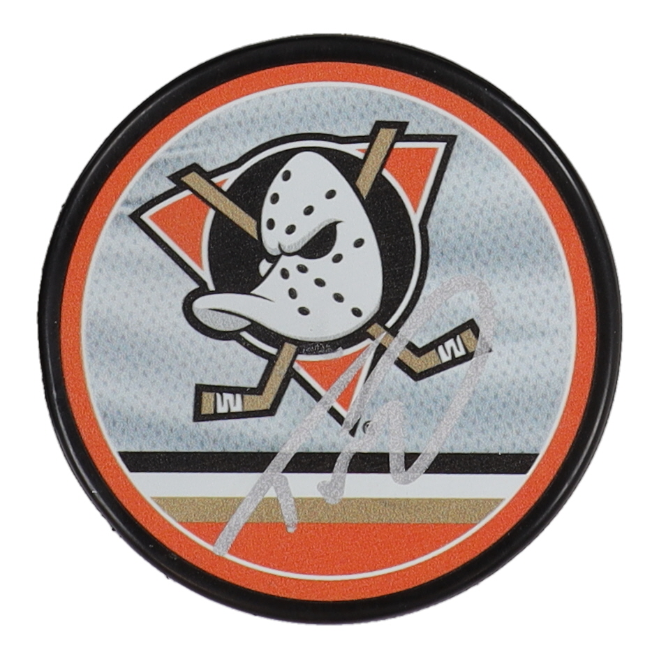 Anaheim Ducks logo hockey puck. Hand-signed by Trevor Zegras.