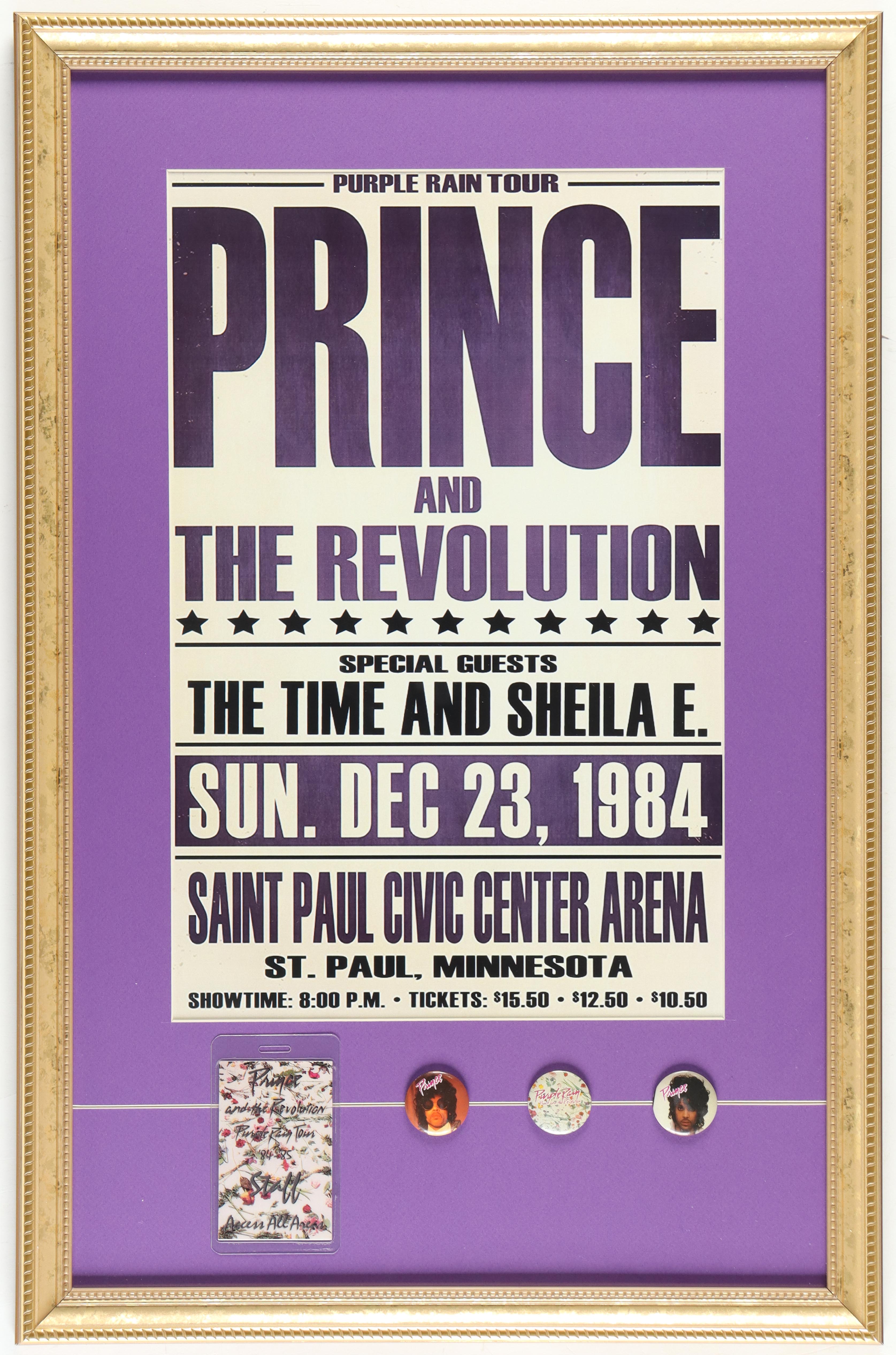 "Prince and The Revolution: Purple Rain Tour" Custom Framed Tour Poster Print Display with 1984-85 Backstage Staff Pass & (3) Vintage Concert Button Pins