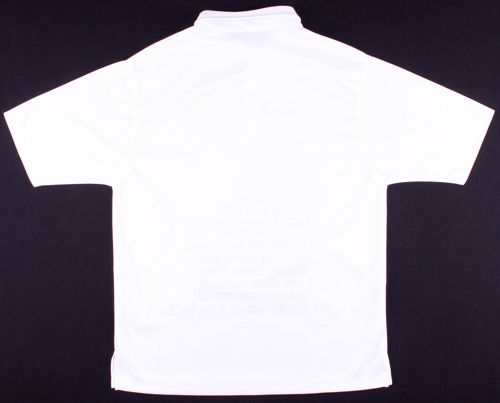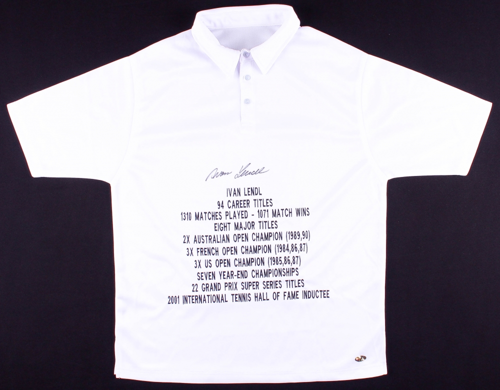 Custom Tennis Shirt. Everything sewn on, size XL. Hand-signed in black felt-tip pen by Ivan Lendl. Lendi's career stats are custom-stitched onto the front of the shirt.