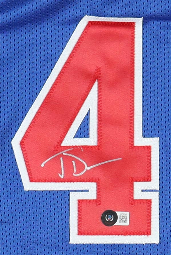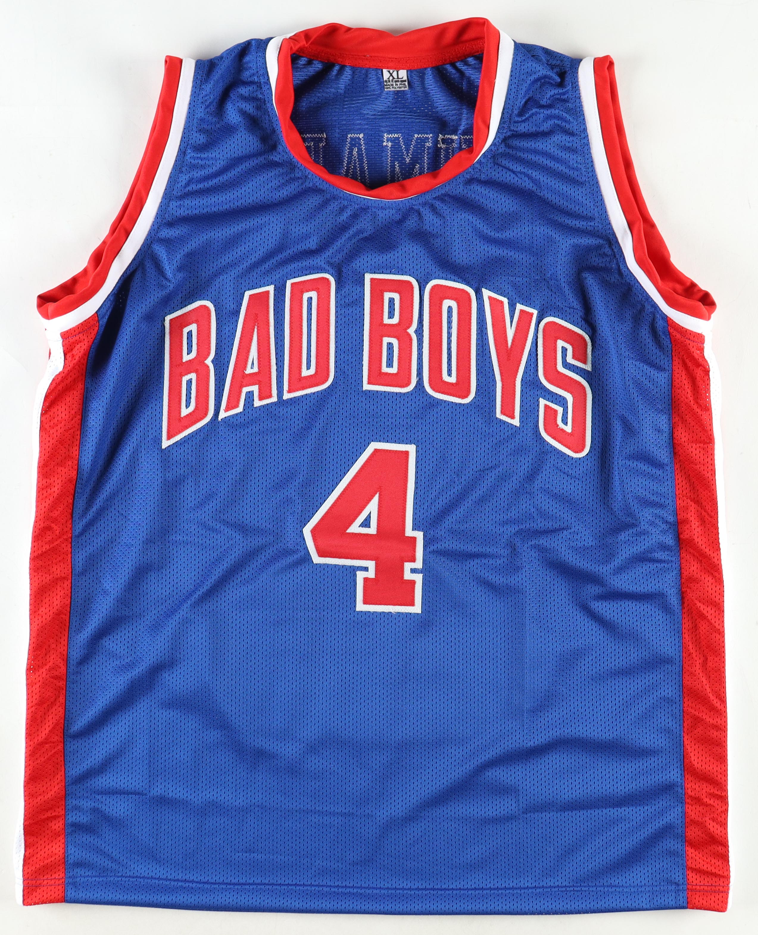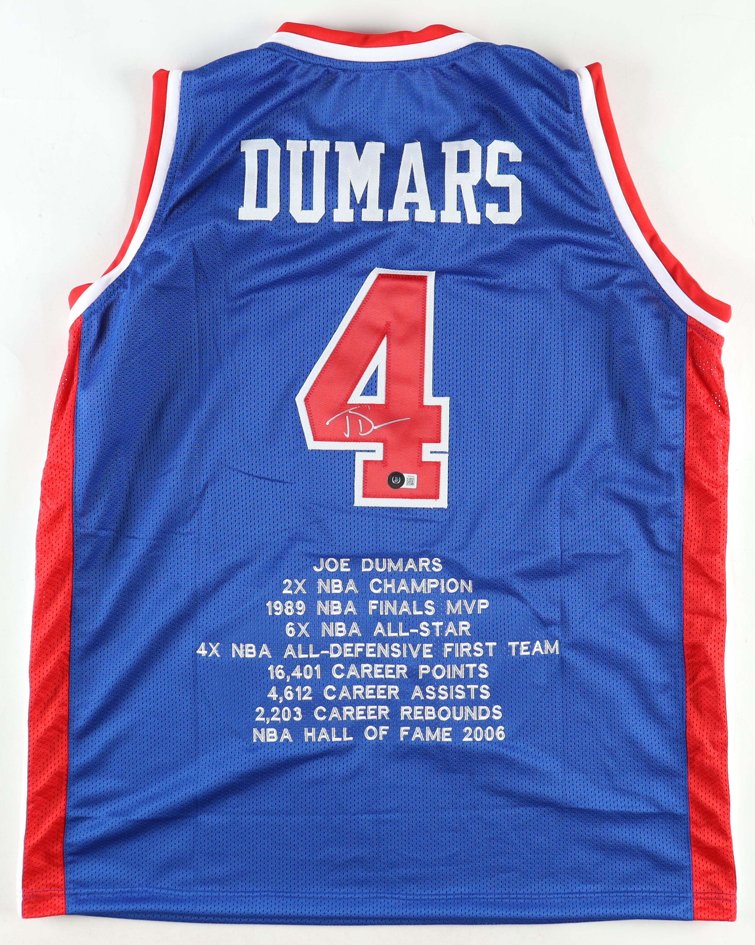 Custom jersey. Everything is sewn on, size XL. Has been hand-signed by Joe Dumars (HOF). Dumar's career highlights have been stitched onto the back of the jersey below the reverse numbers.