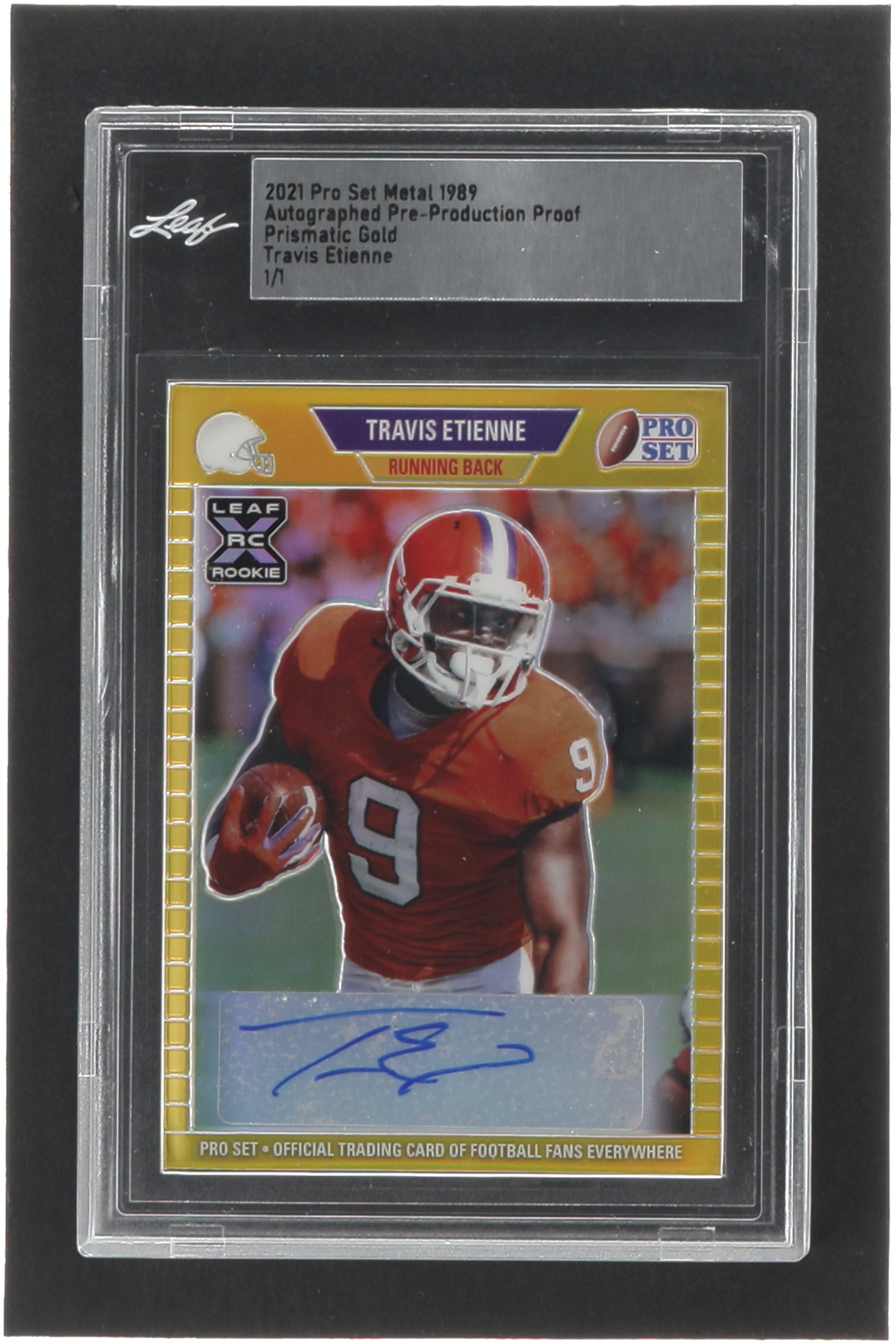 Travis Etienne 2021 Pro Set Metal 1989 Autographed Pre-Production Proof Prismatic Gold #1/1 (Leaf)