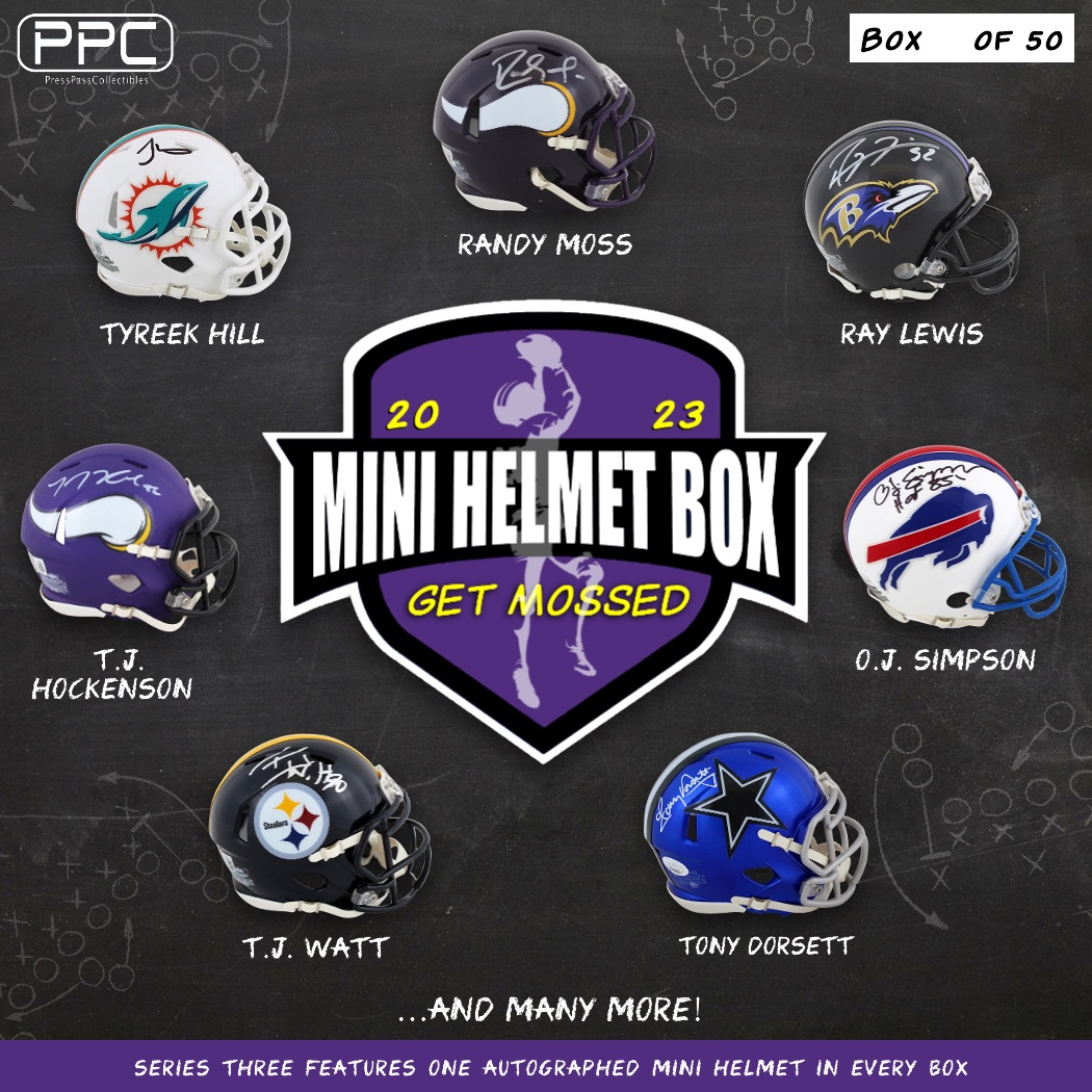 The Press Pass Collectibles 2023 get mossed mini helmet mystery box includes one (1) mini helmet from your favorite NFL teams. Some boxes will feature mini helmets signed Tyreek Hill, T.J. Hockenson, T.J. Watt, and many more!