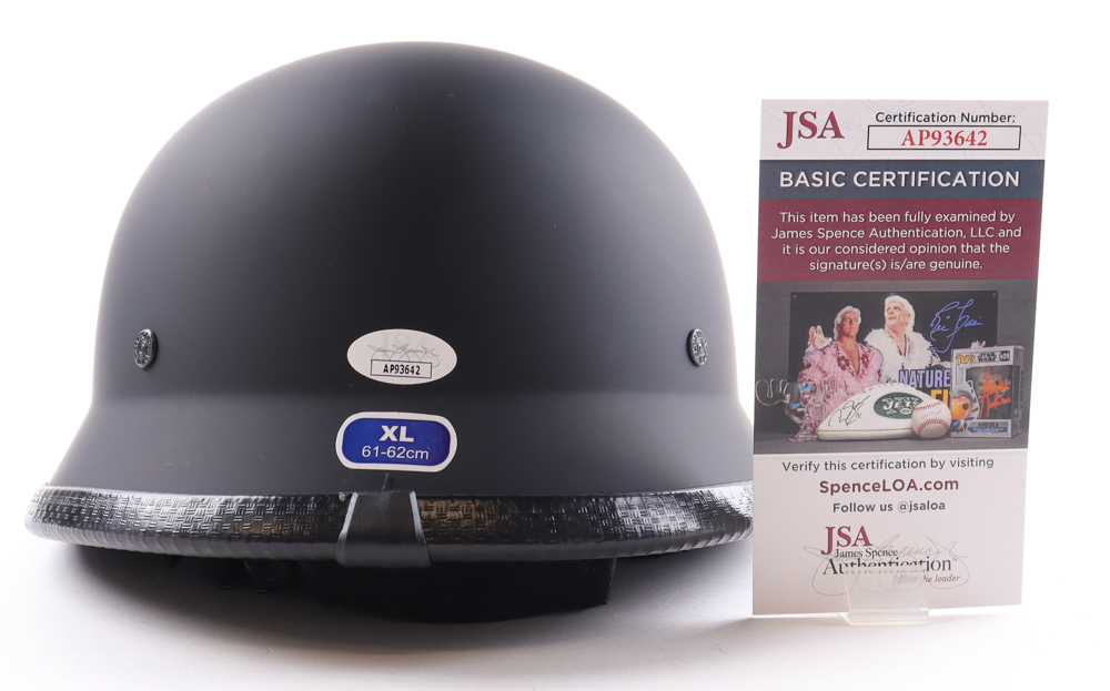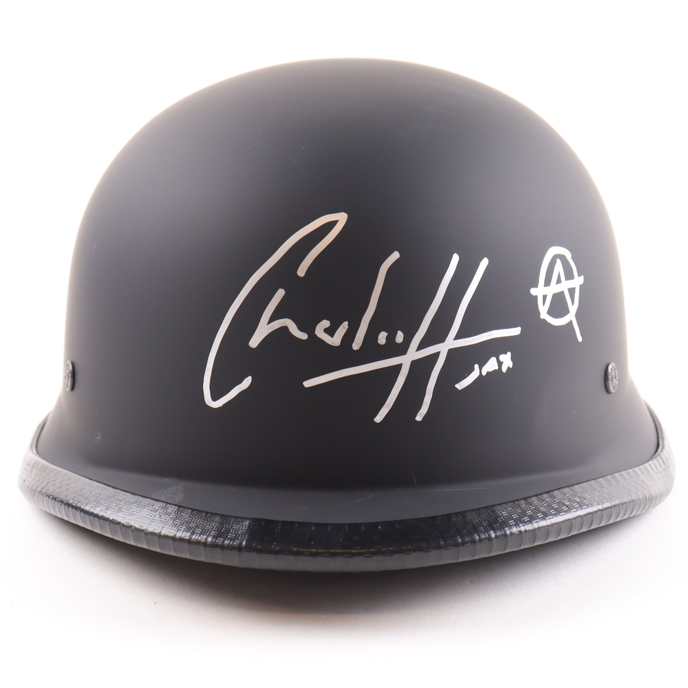 Biker helmet has been hand-signed and inscribed by Charlie Hunnam (Jax Teller). Includes hand-drawn sketch of anarchist symbol.