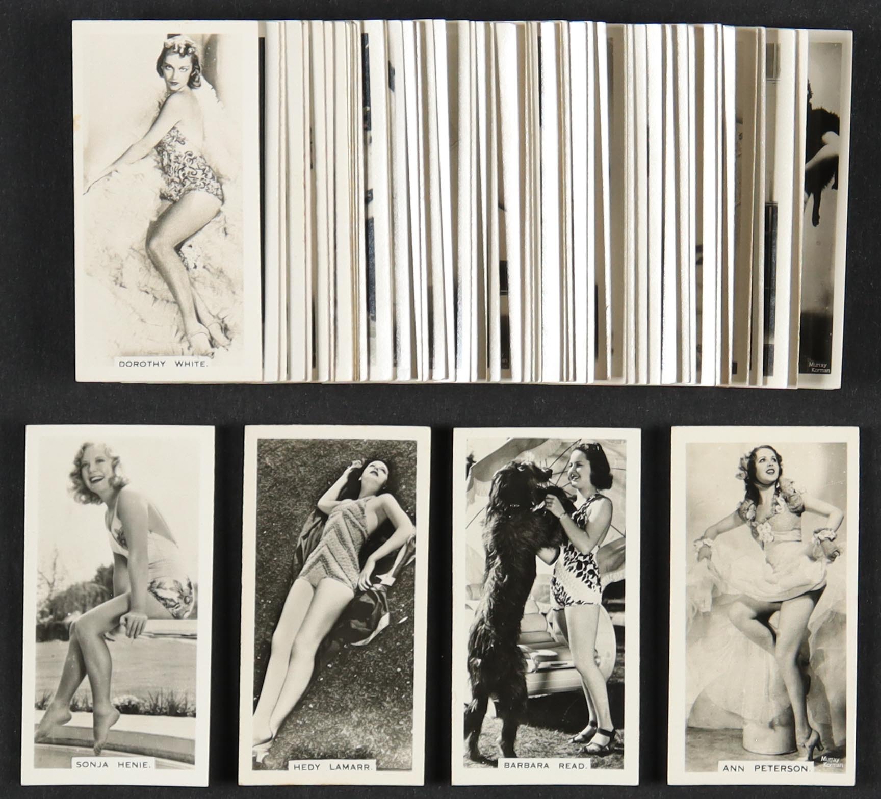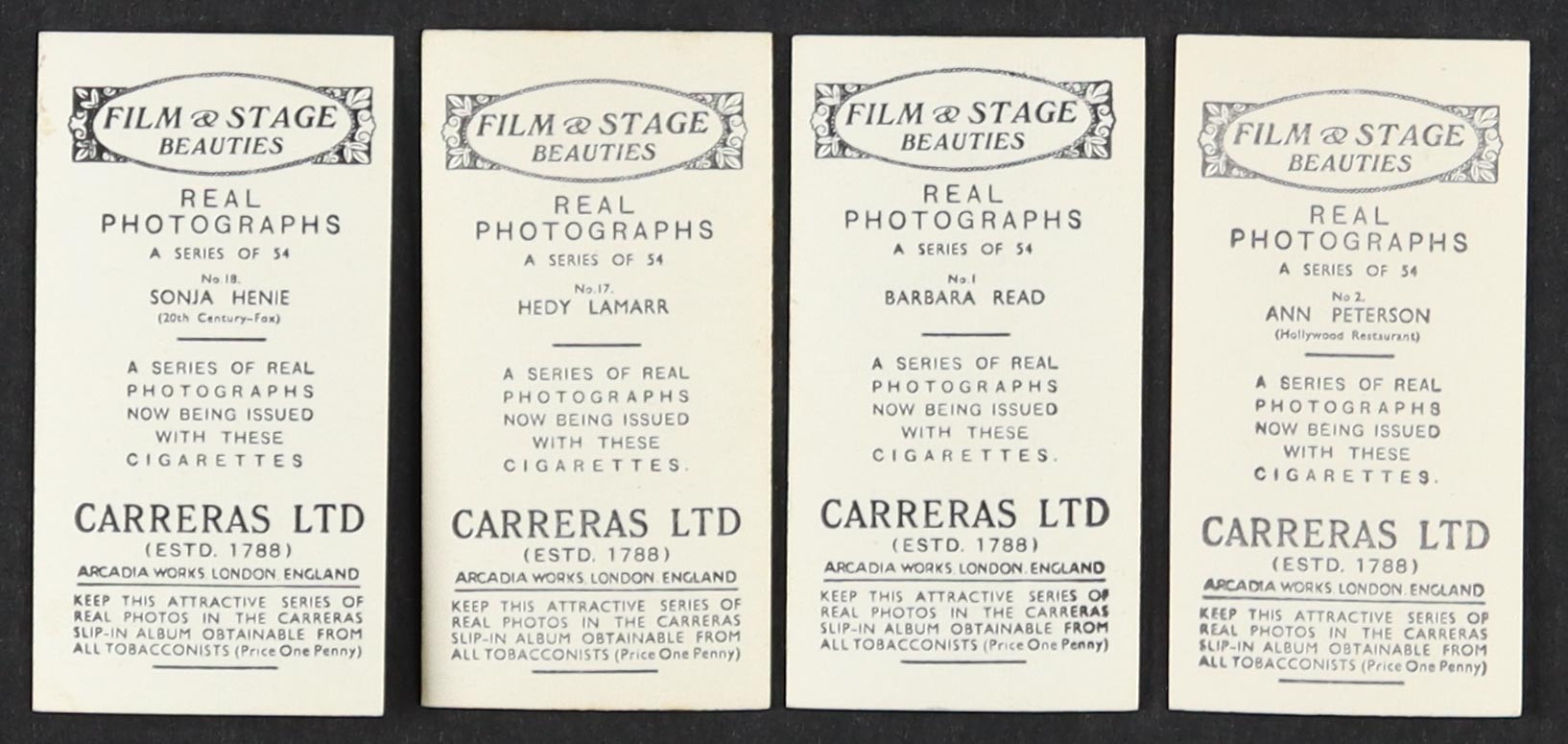 1939 Carrera's "Film & Stage" Complete Set of (54) Cigarette Cards with Sonja Henie #18, Hedy Lamarr #17, Barbara Read #1, Ann Peterson #2