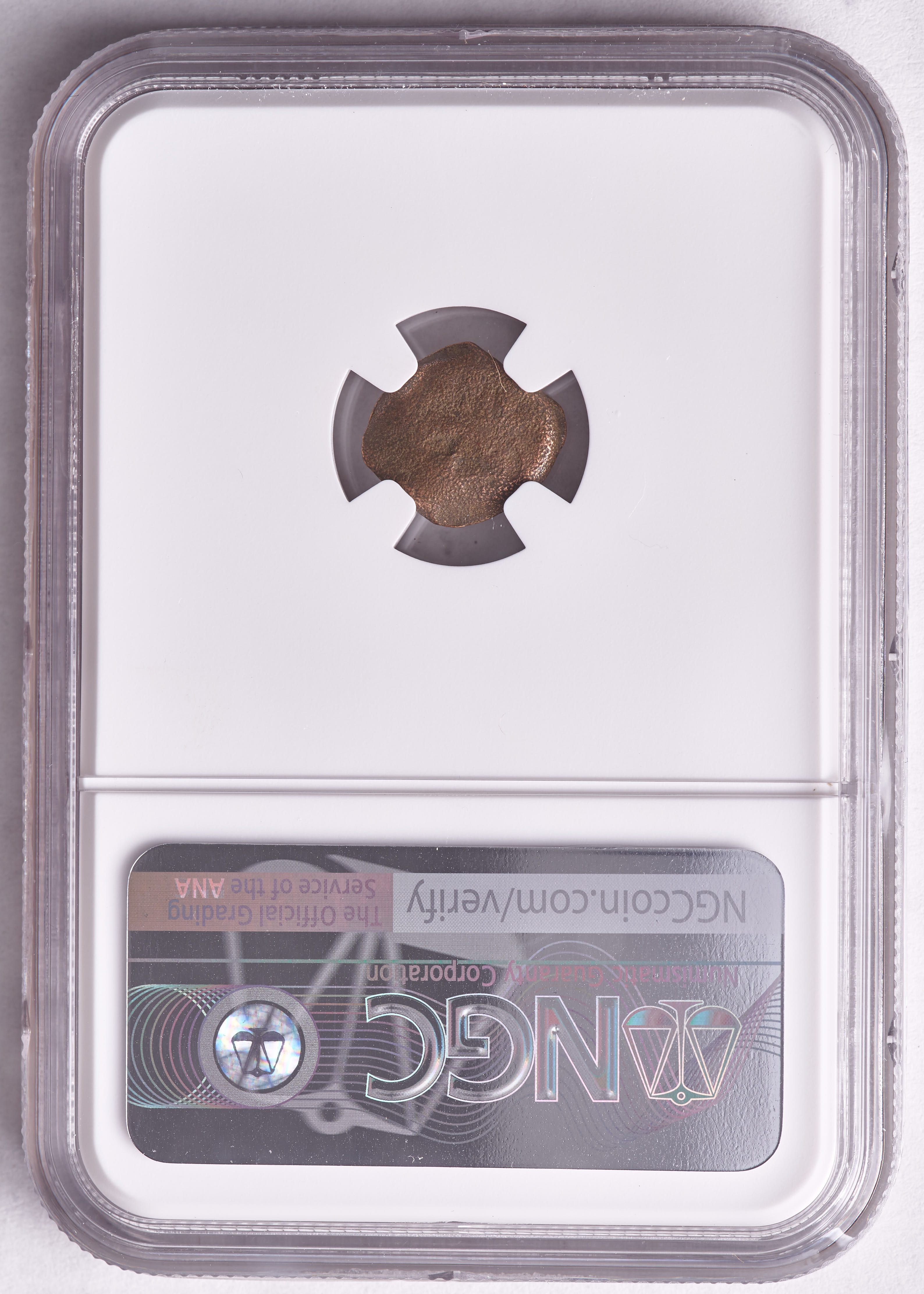 Very rare authentic bronze Mite coin. The coin has been authenticated and encapsulated by NGC (Numismatic Guaranty Corporation).