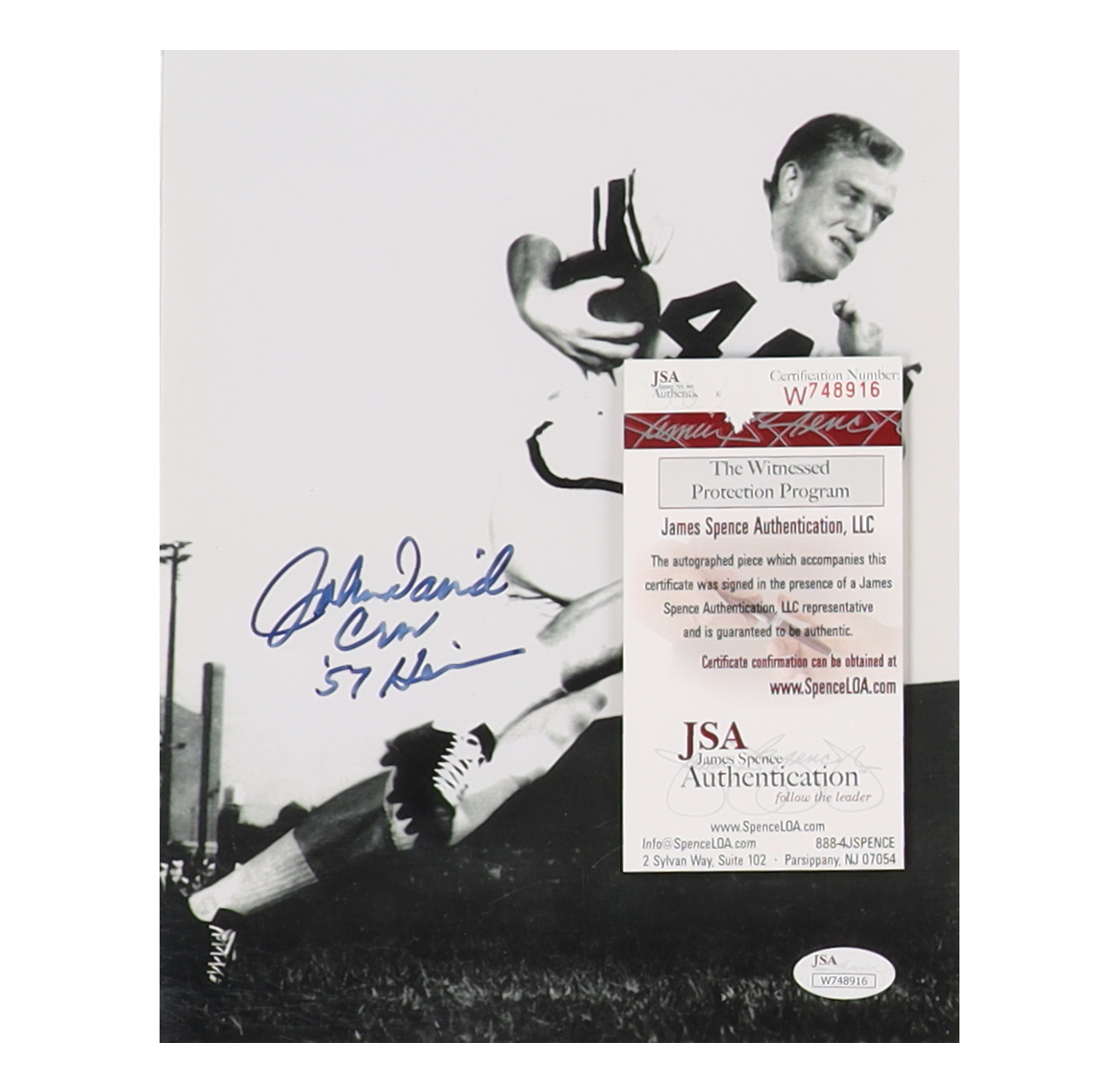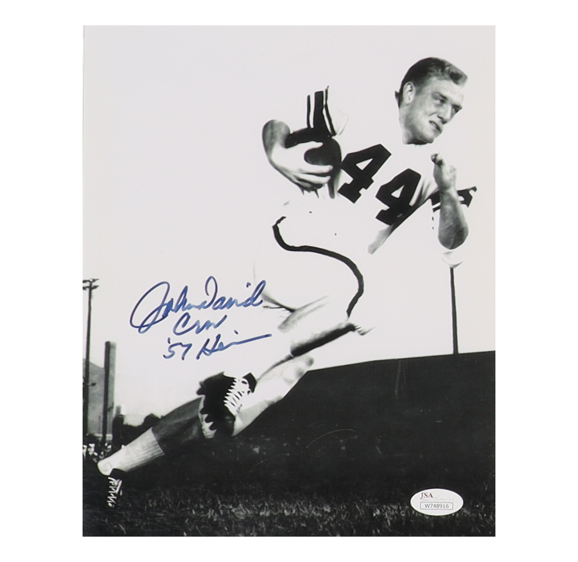 Photo measures 8" x 10" in size. Hand-signed and inscribed by John David Crow (D. 2015, Texas A&M Aggies).