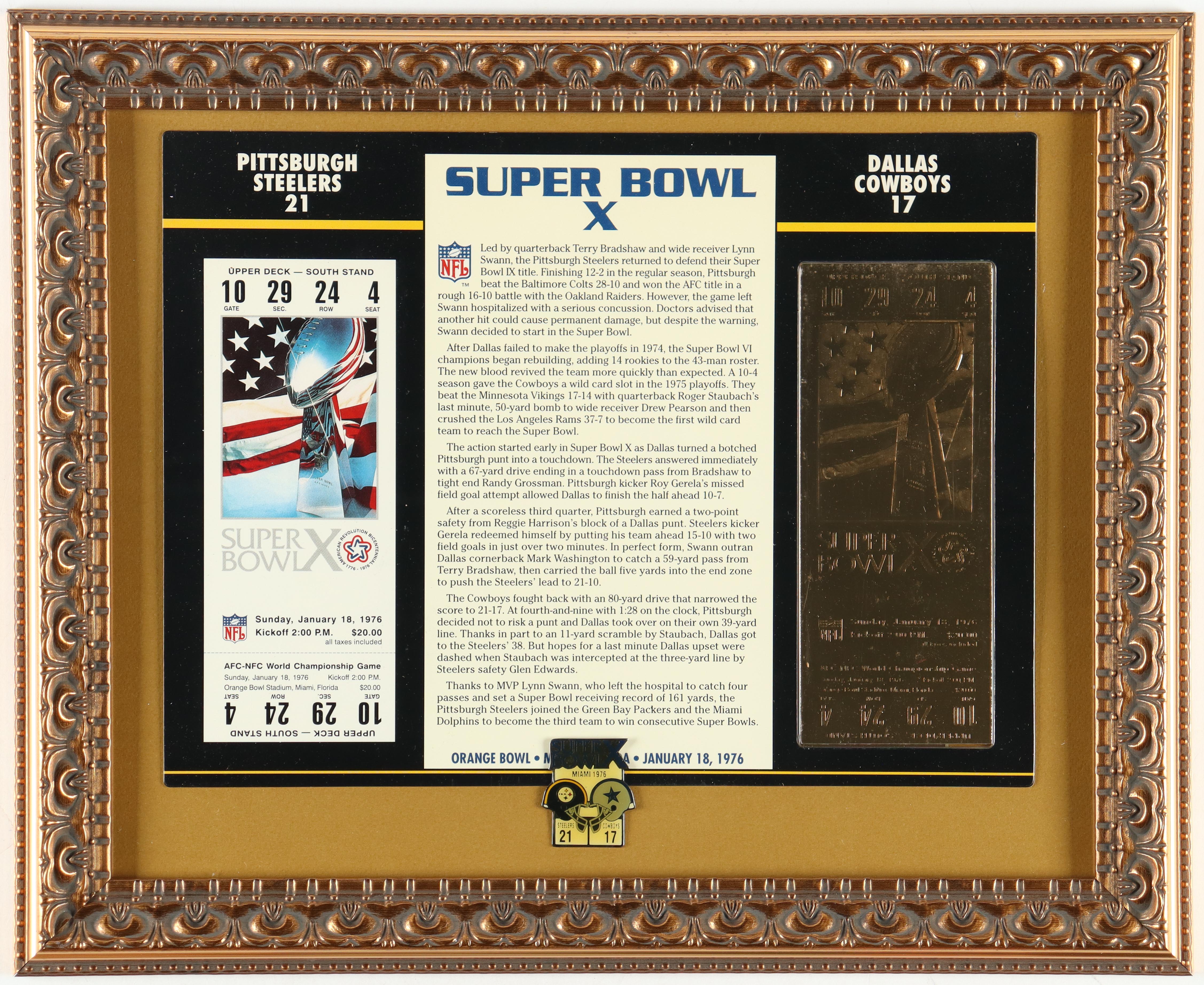 Custom framed display measures 13" x 16" in size and features a Super Bowl X 23kt gold ticket and official Super Bowl X Pin.
