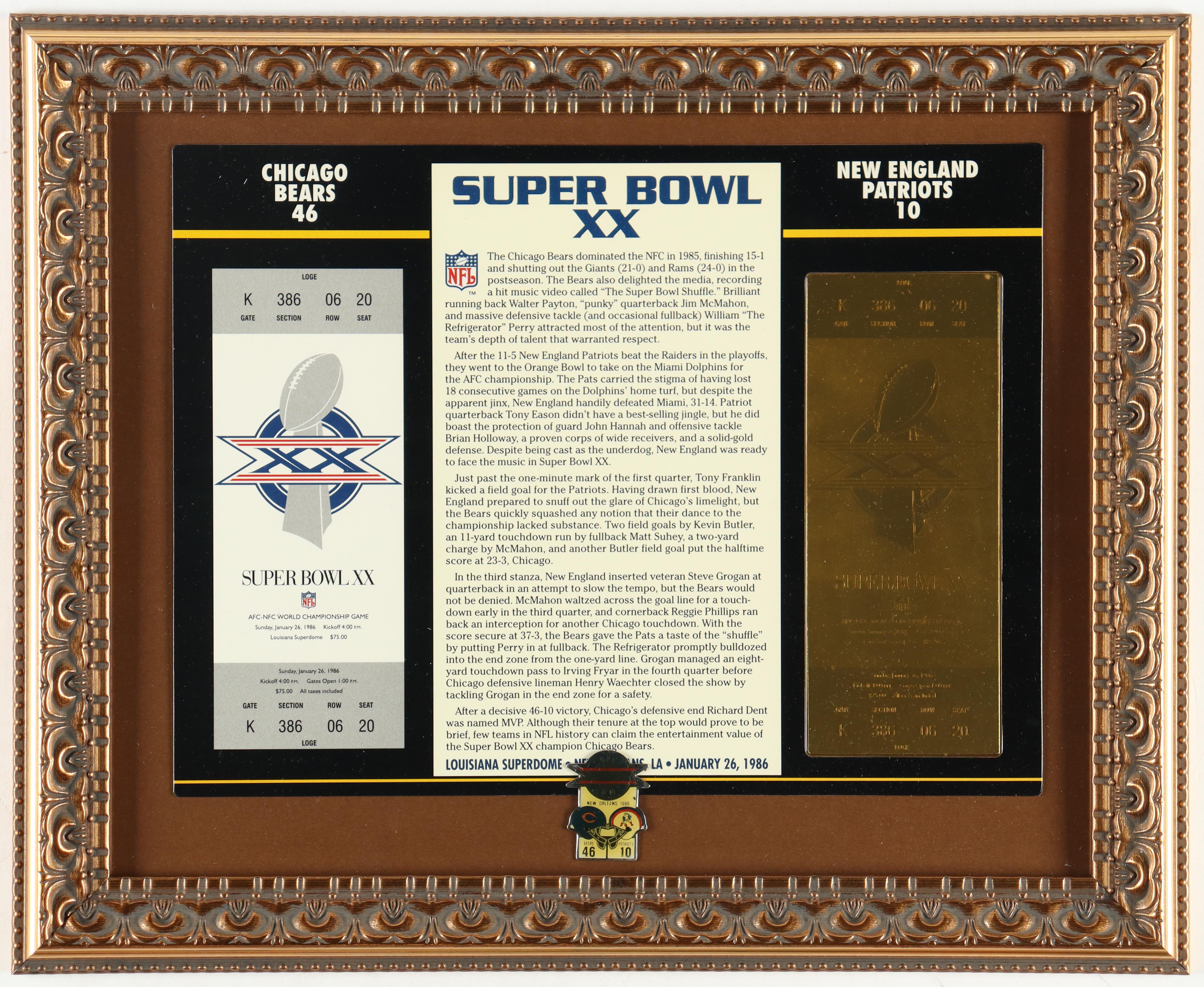 Custom framed display measures 13" x 16" in size and features a Super Bowl XX 23kt gold ticket and official Super Bowl XX Pin.