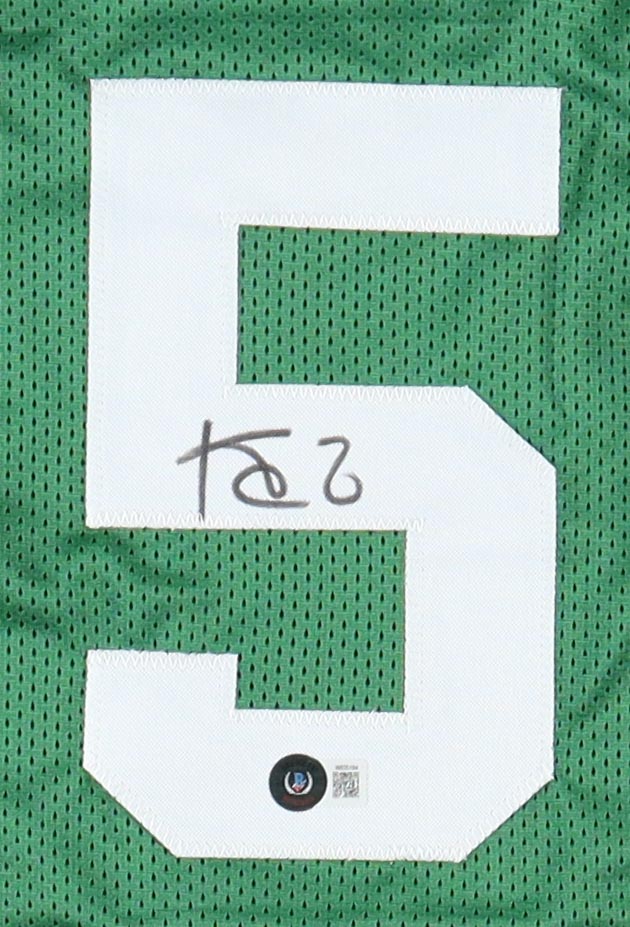 Custom jersey with everything sewn on, size XL. Hand-signed by Kevin Garnett (HOF). Garnett's career highlights have been custom stitched onto the back of the jersey below the reverse numbers.