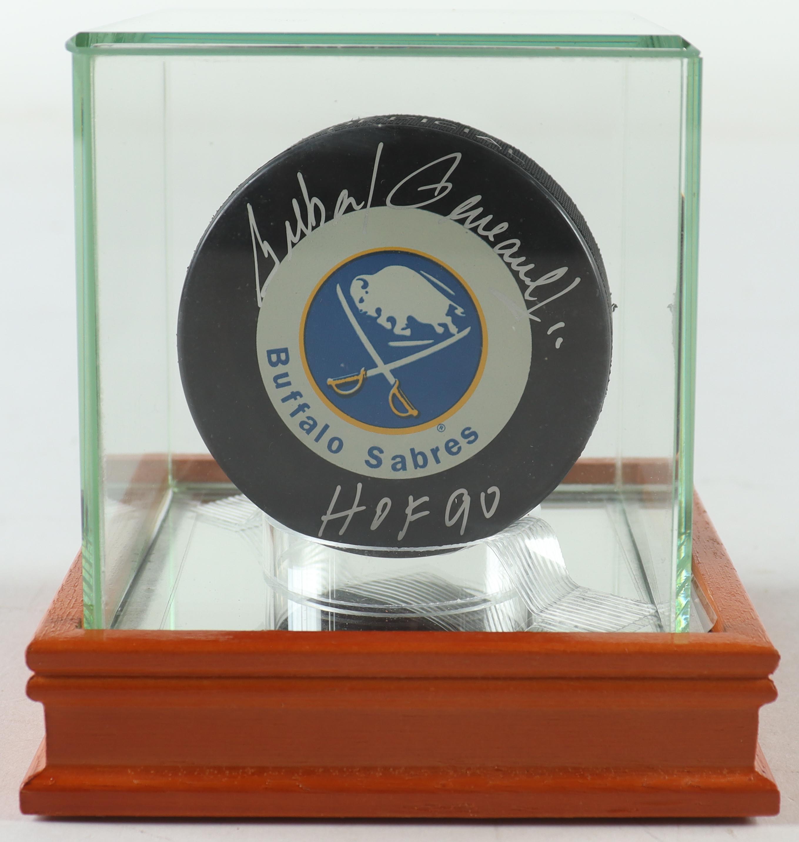 Buffalo Sabres logo hockey puck has been hand-signed and inscribed by Gilbert Perreault (HOF). Includes display case as shown.