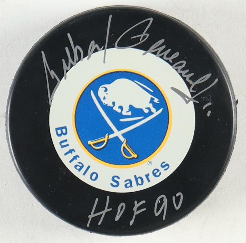 Gilbert Perreault Signed Sabres Logo Hockey Puck with Display Case Inscribed "H.O.F. 90" (PSA)