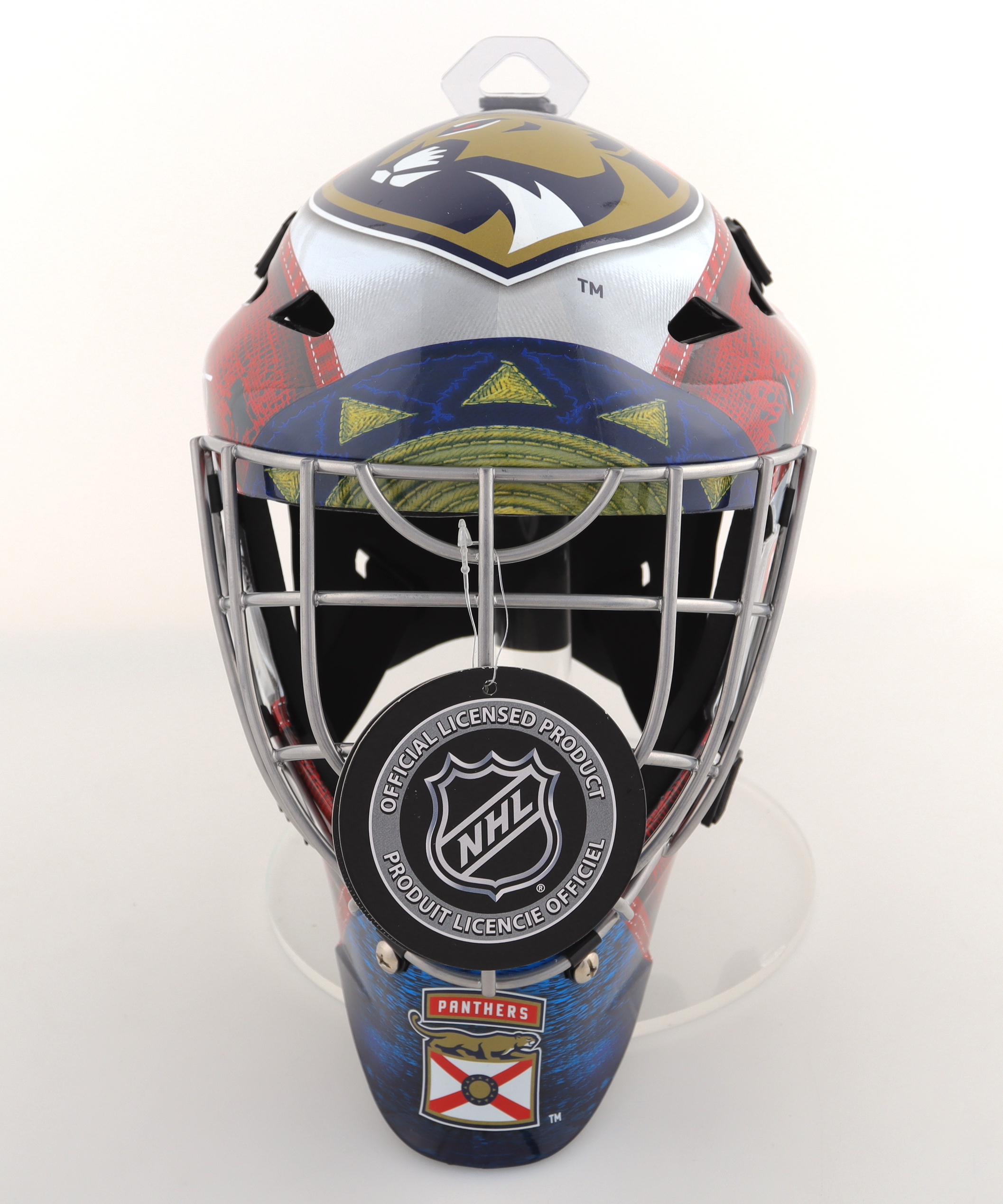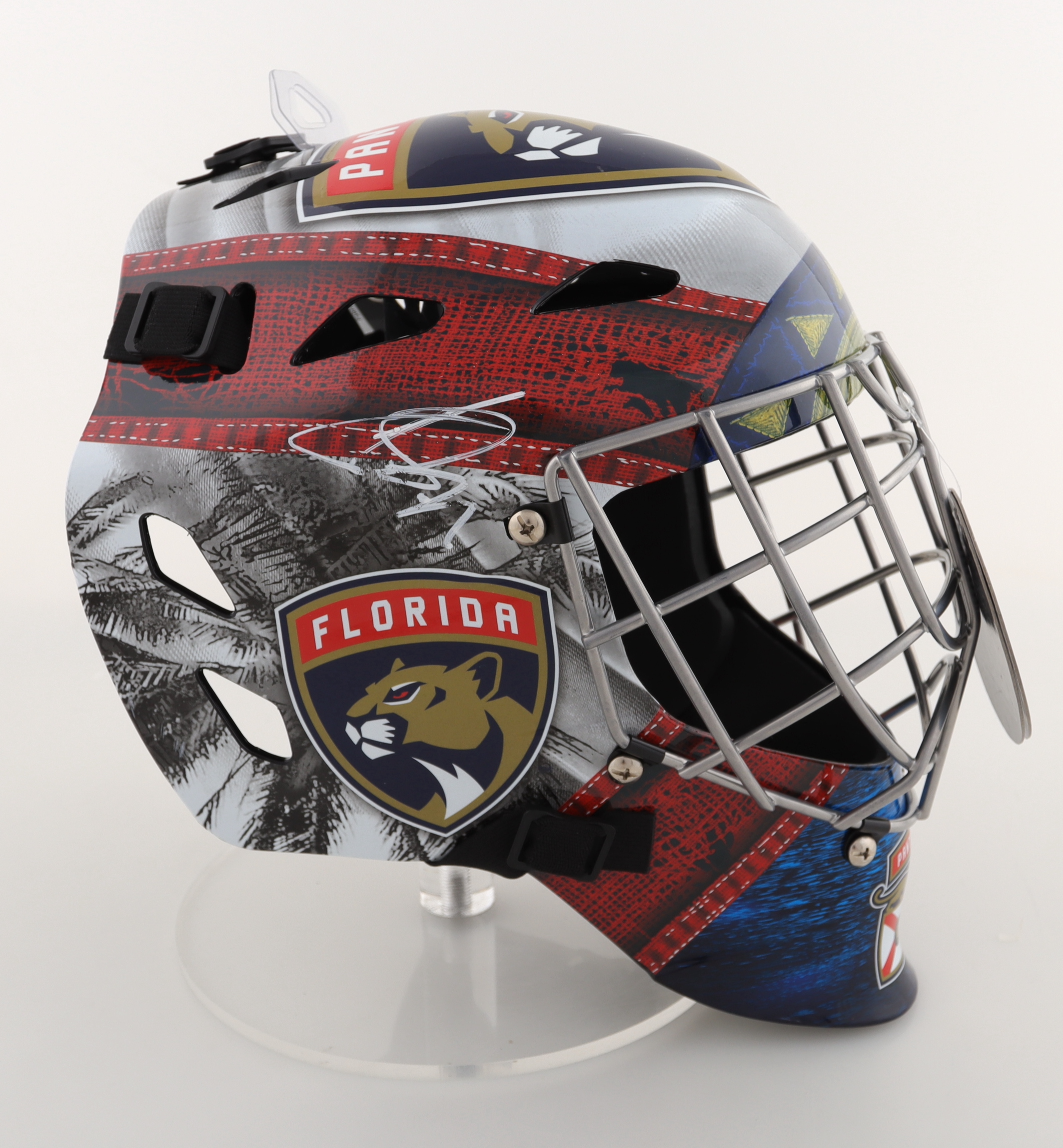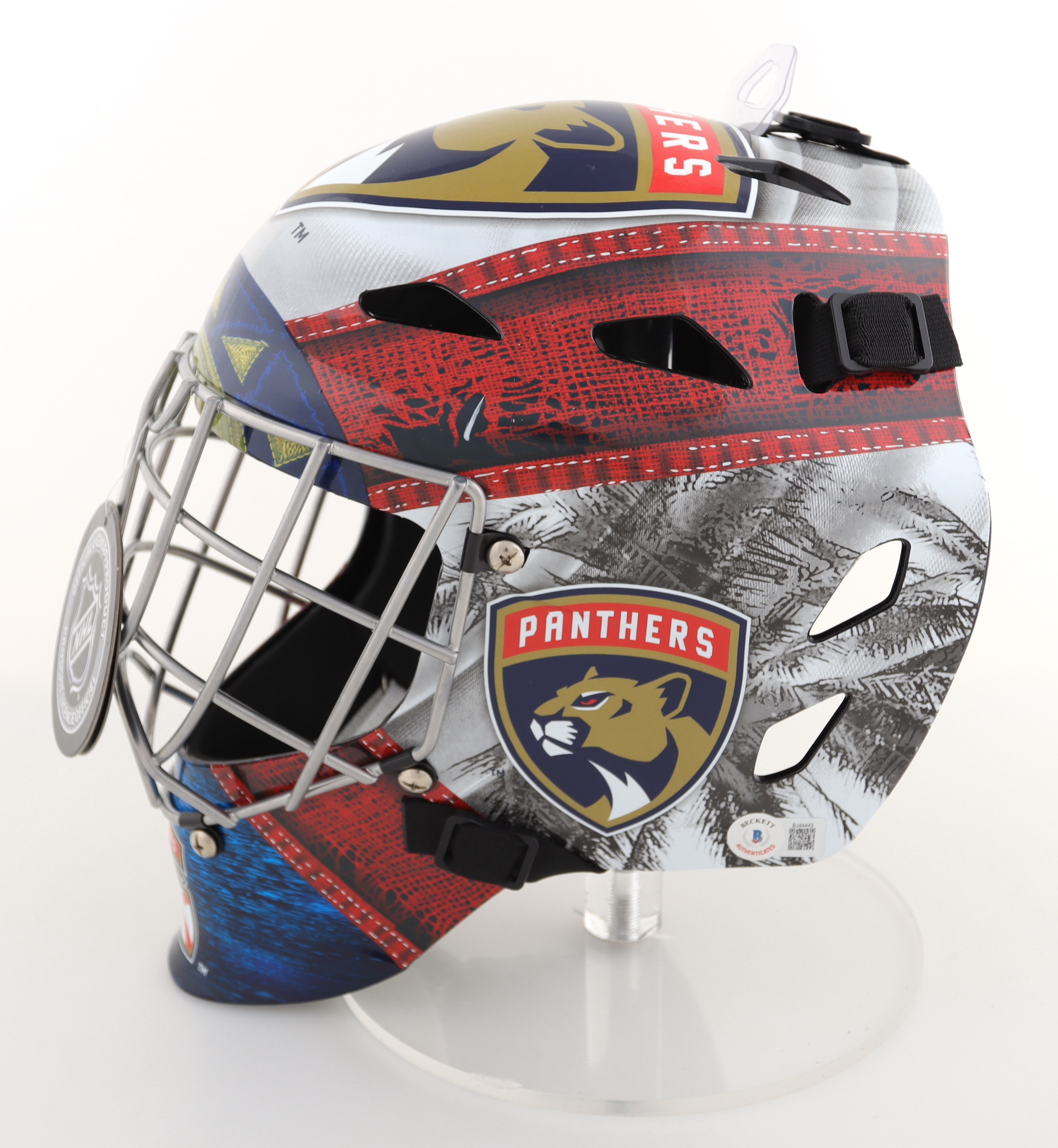 Franklin Florida Panthers full-size hockey goalie mask. Hand-signed by Sergei Bobrovsky.