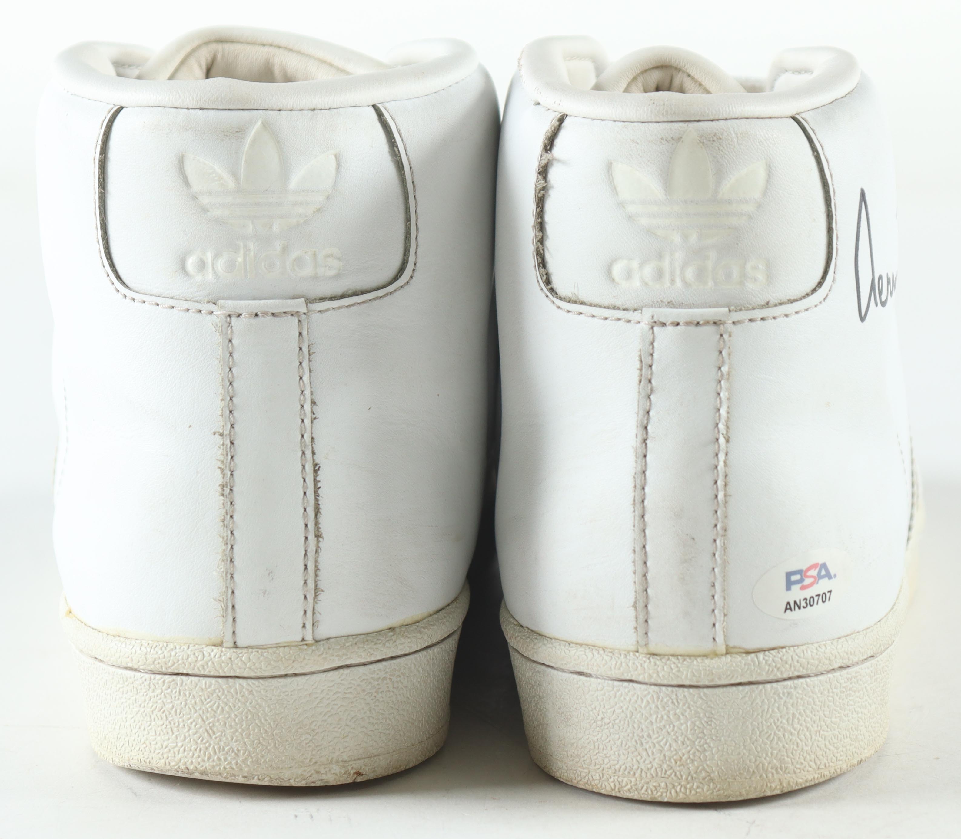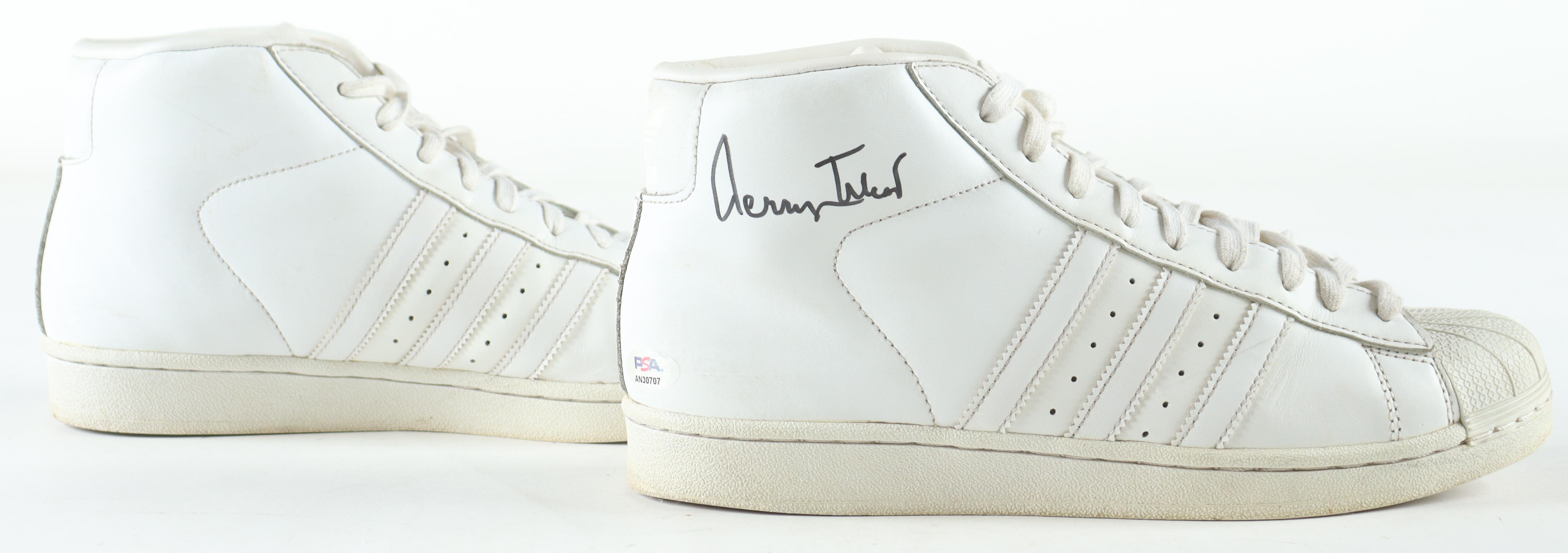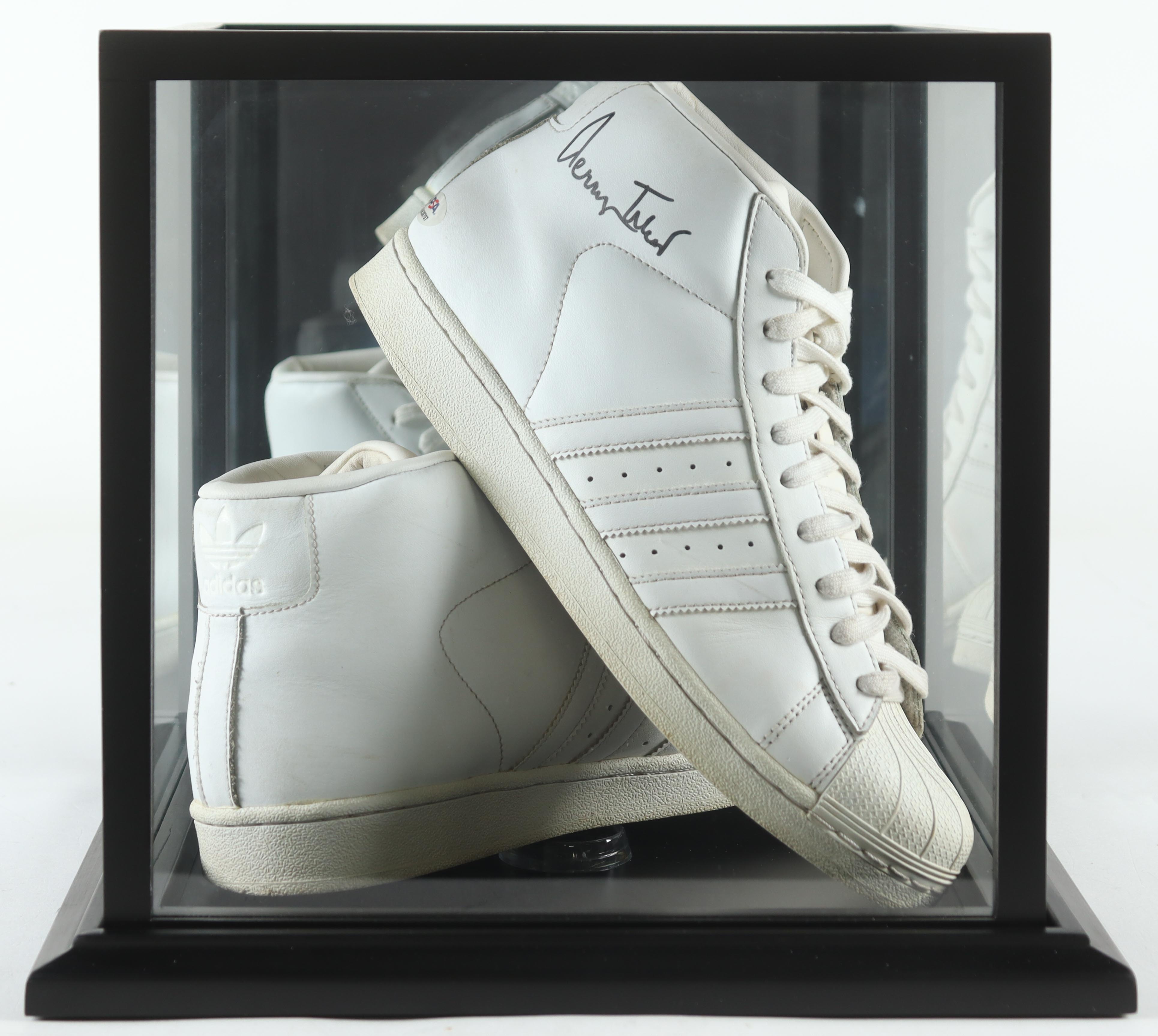 Pair of Adidas All-Star basketball shoes. Hand-signed by Jerry West (Los Angeles Lakers, HOF) with black wood display case.