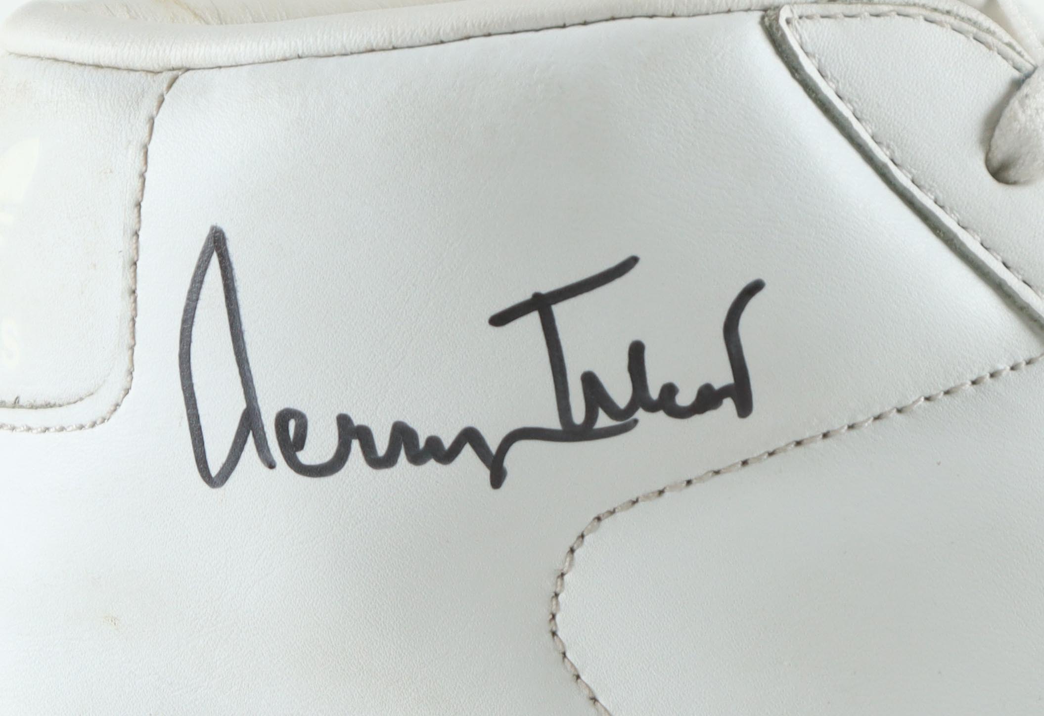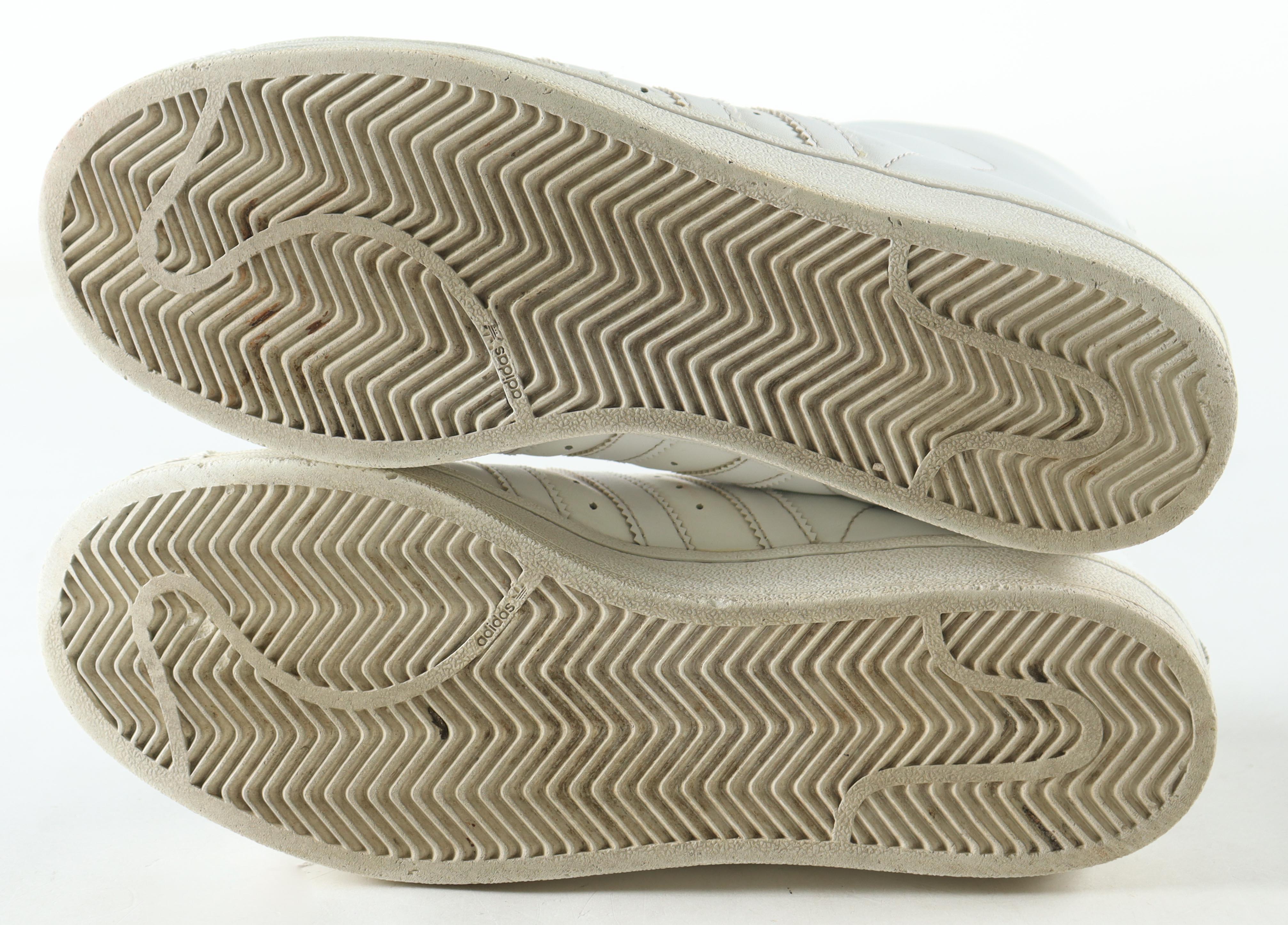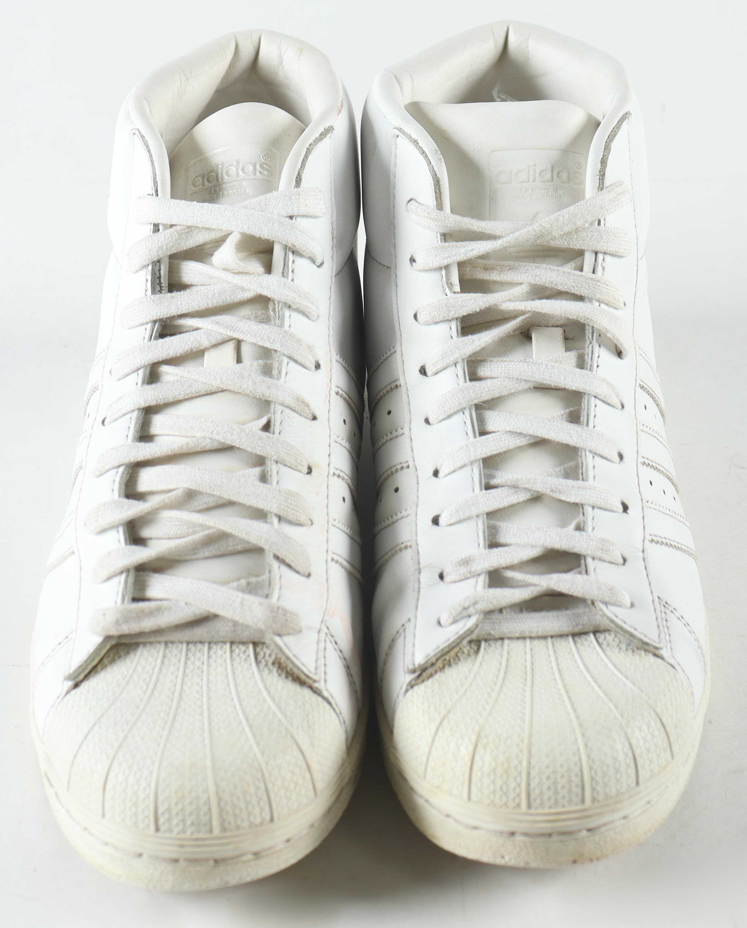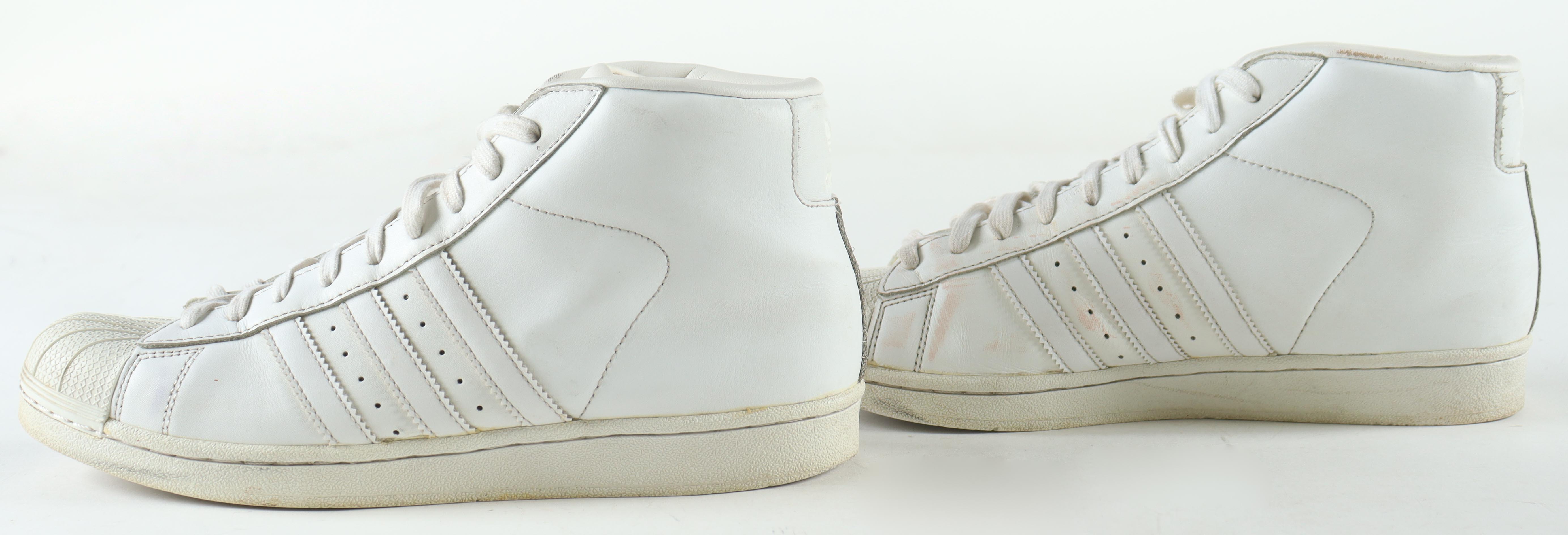Pair of Adidas All-Star basketball shoes. Hand-signed by Jerry West (Los Angeles Lakers, HOF) with black wood display case.