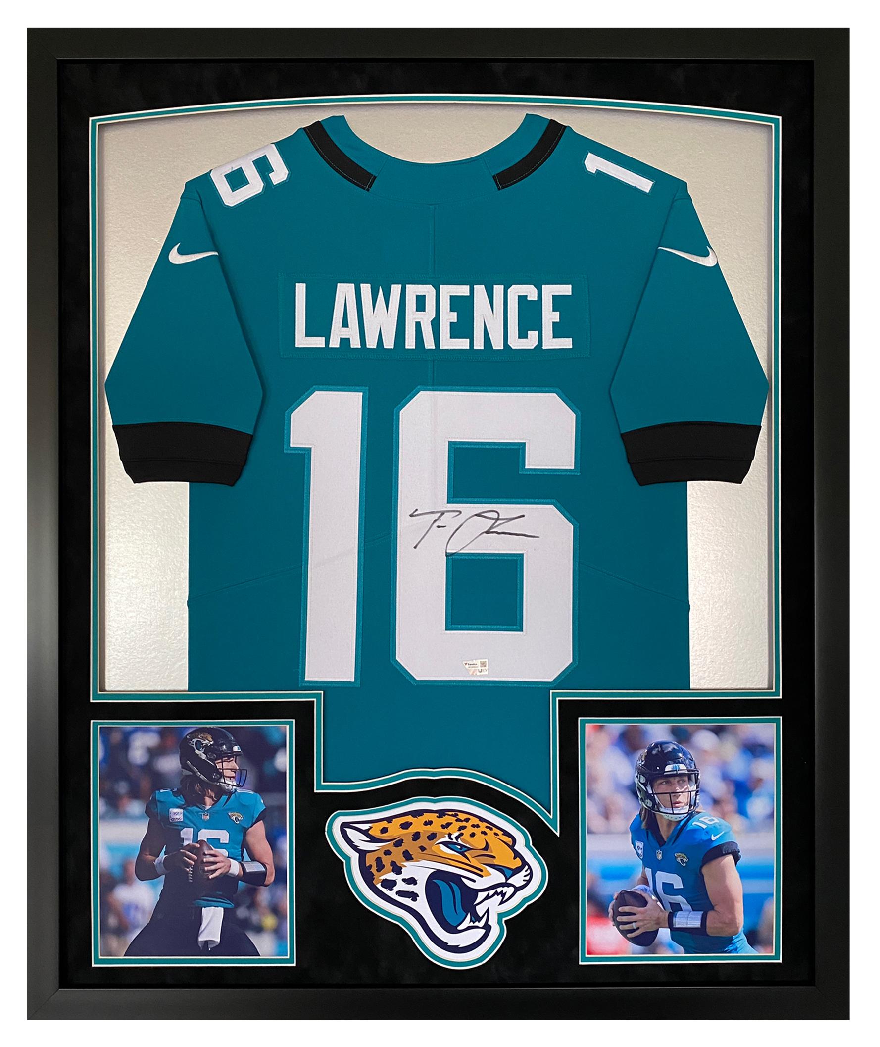 Custom framed display measures 32" x 40" in size and features an authentic Nike Limited jersey that has been hand-signed by Trevor Lawrence (Jacksonville Jaguars).