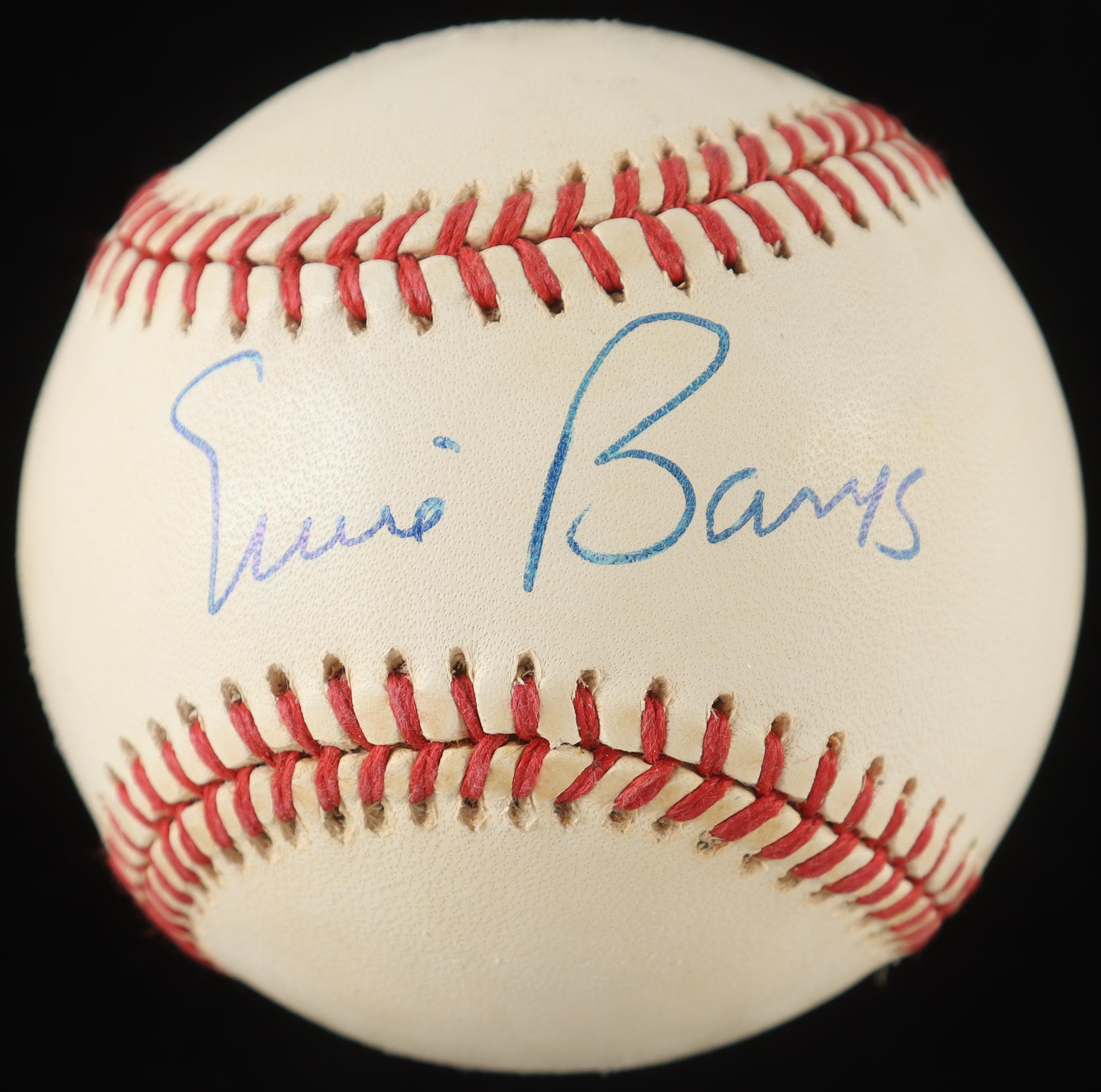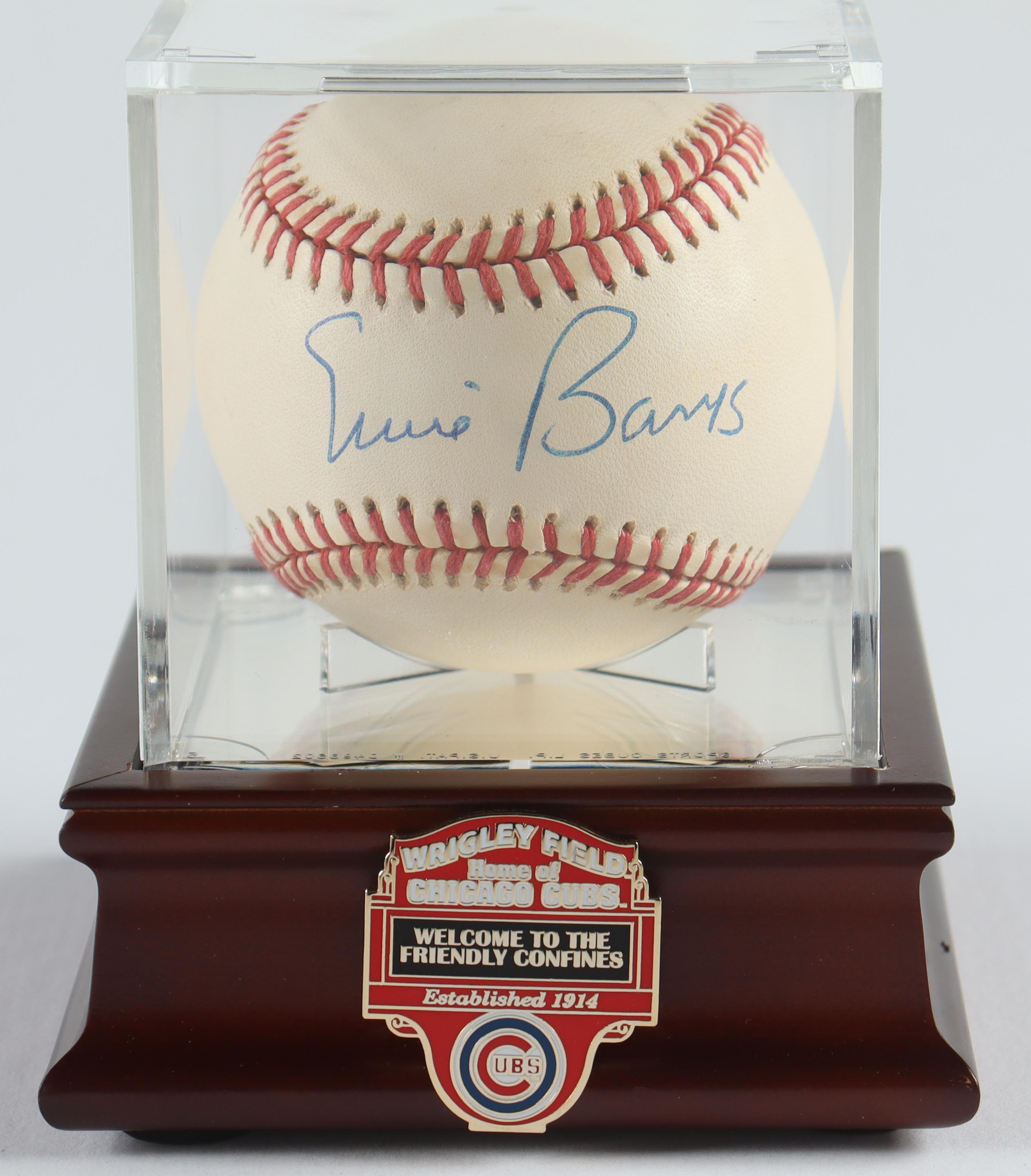 Rawlings Official National League baseball. Hand-signed by Ernie Banks (D. 2015, Chicago Cubs, HOF). The display case and pin are included as shown. Please note, the ball is naturally toned.
