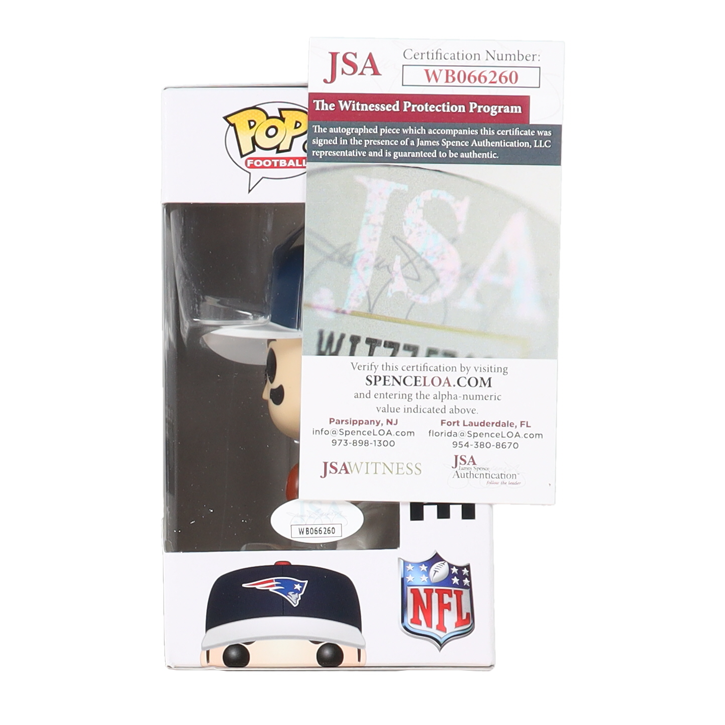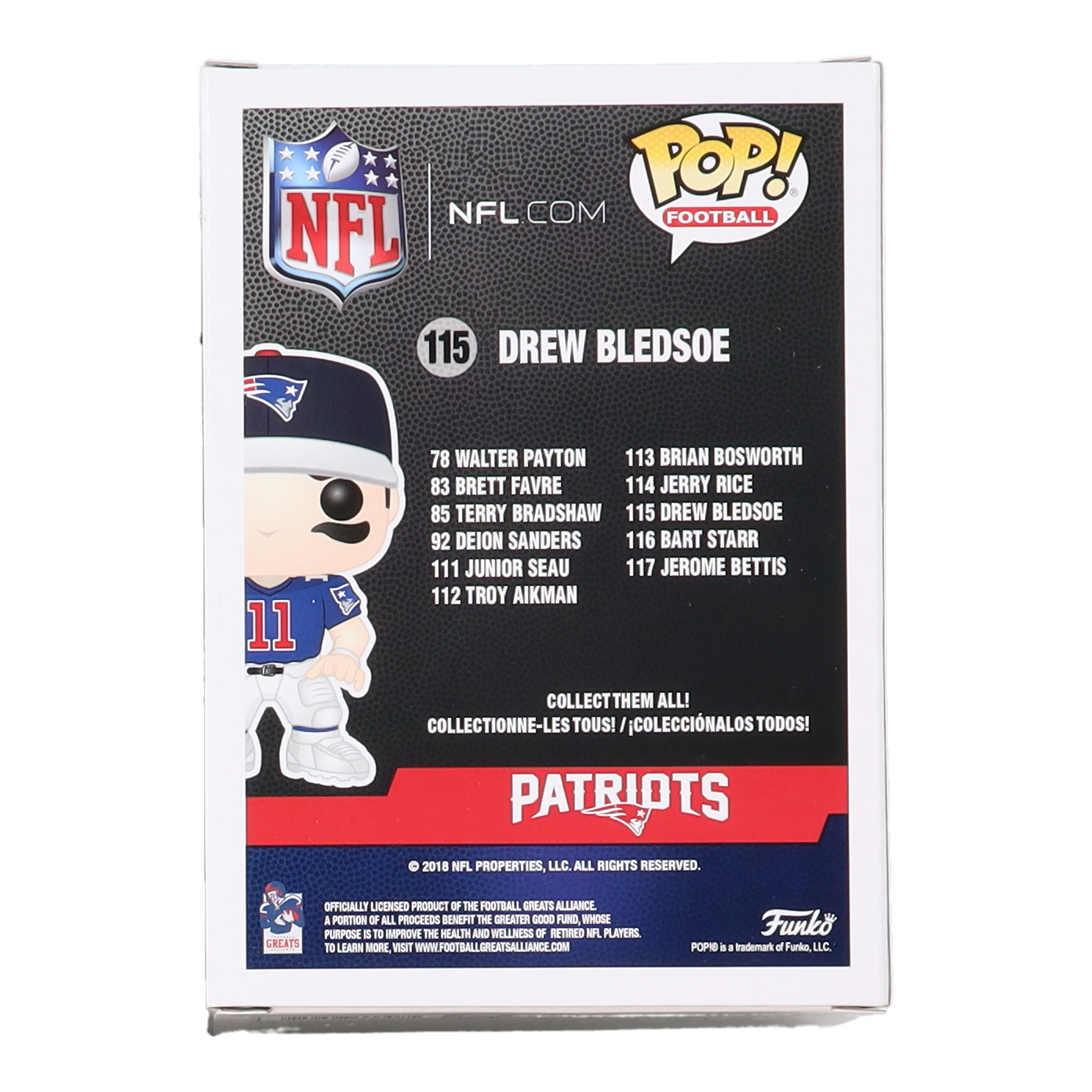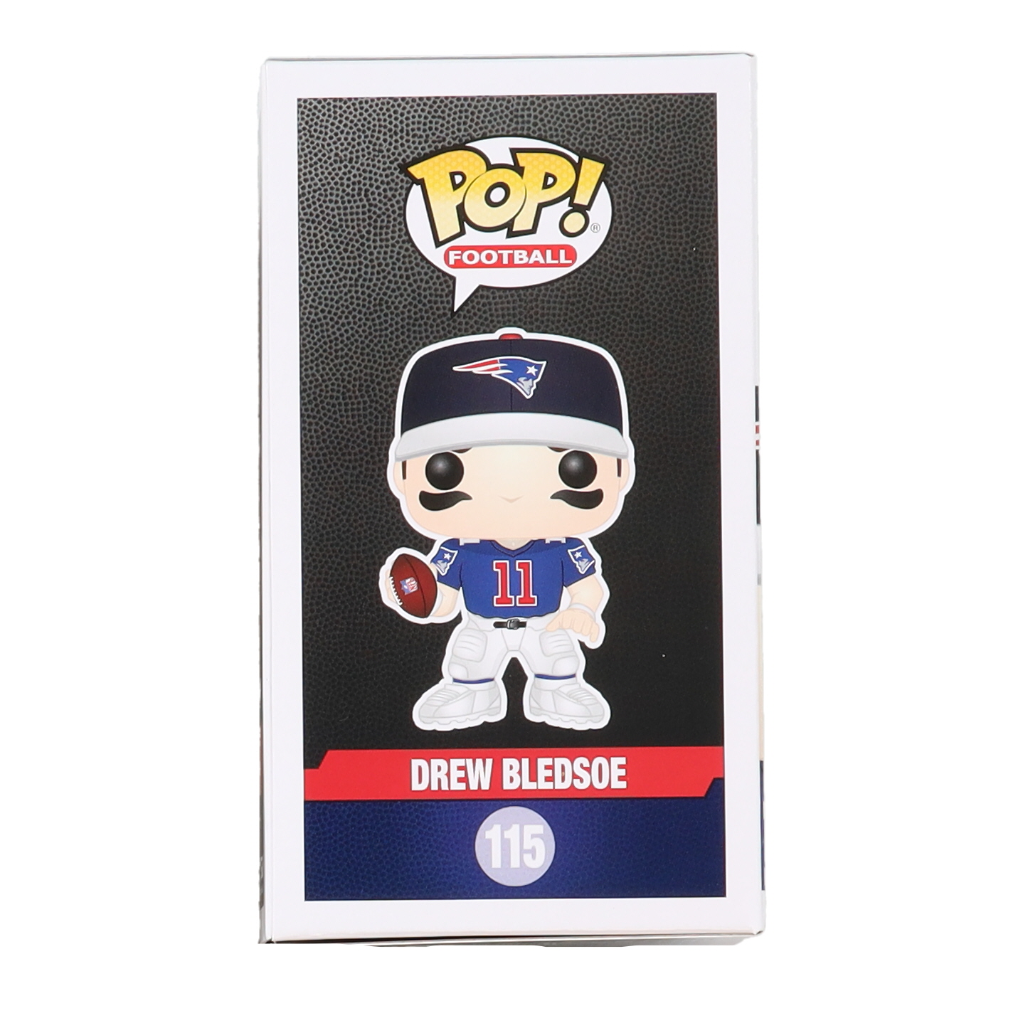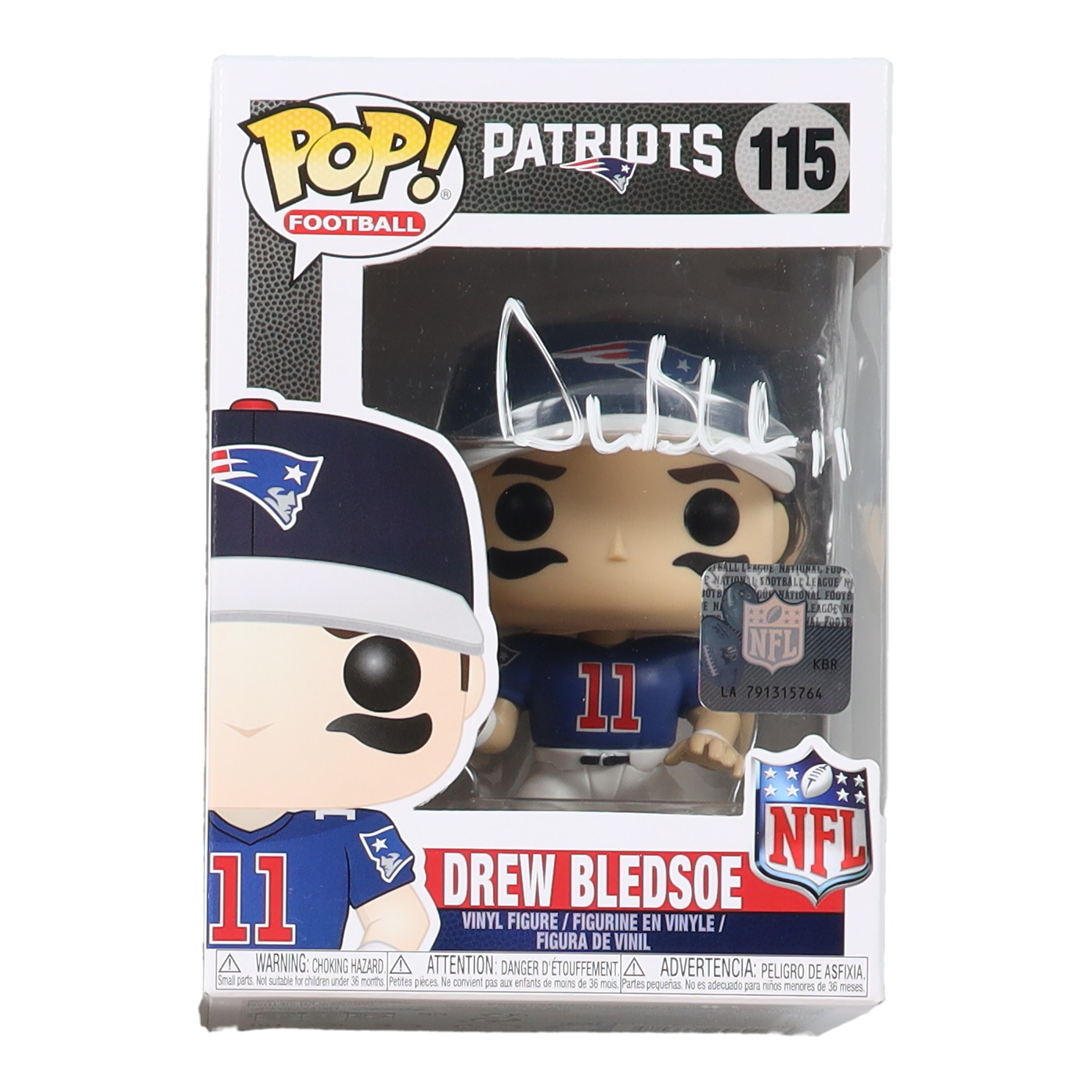 Funko Pop! figure measures approximately 4" tall and has been hand-signed on the packaging by Drew Bledsoe (New England Patriots).