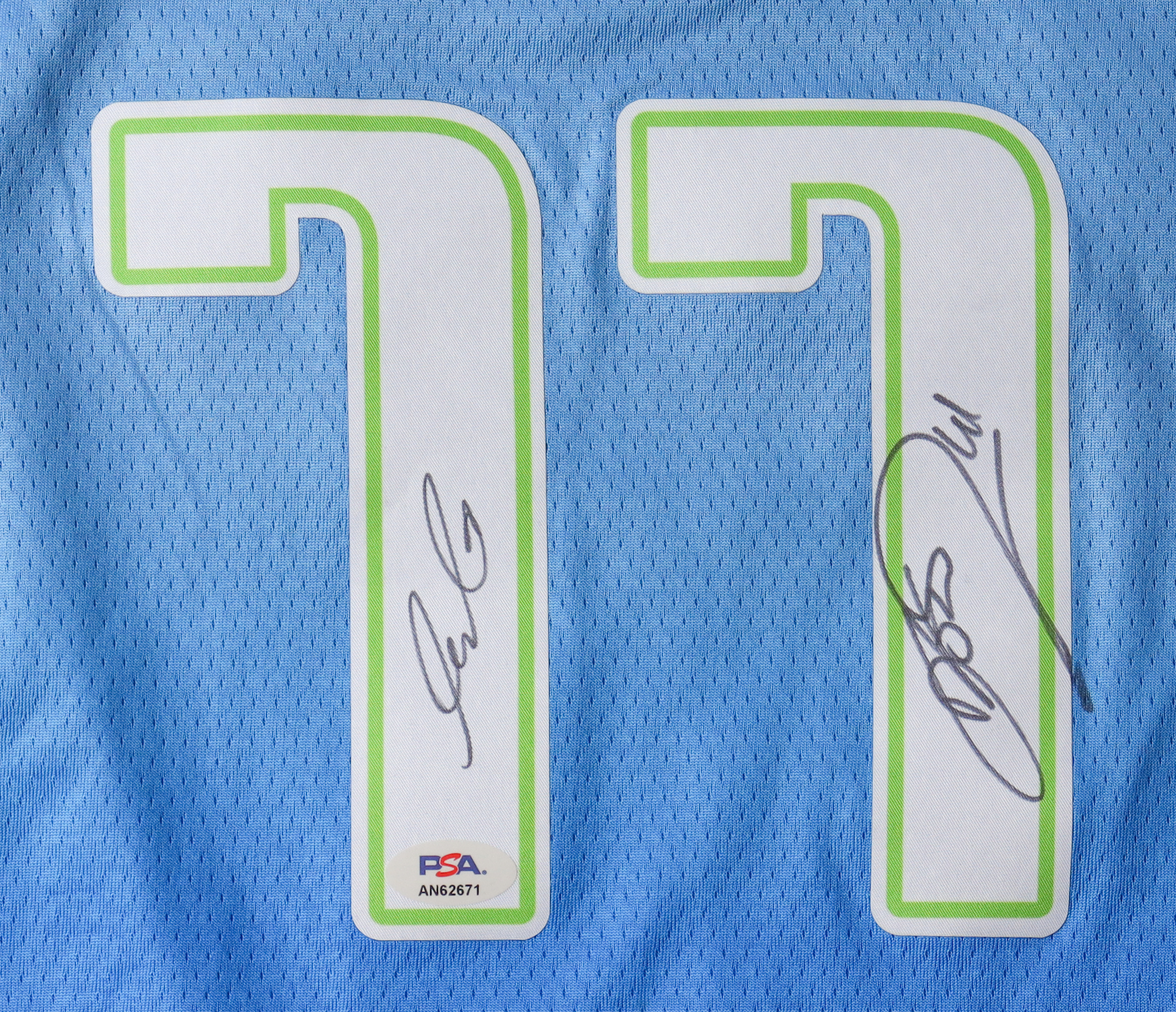 Nike style jersey with everything printed on, size 48. Hand-signed by Luka Doncic (Dallas Mavericks) and Dirk Nowitzki (Dallas Mavericks, HOF).