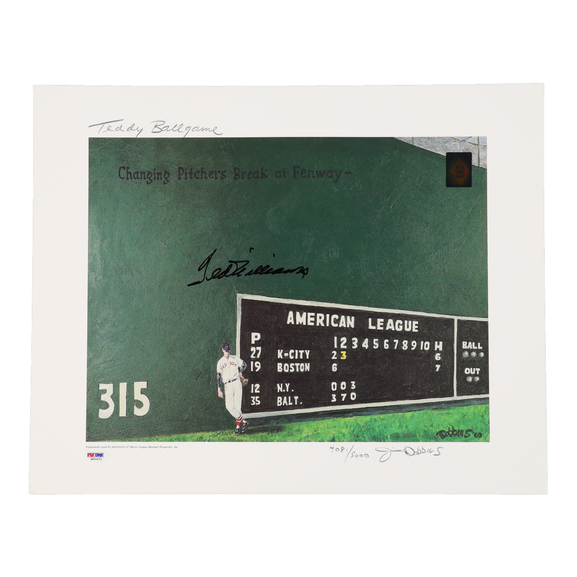 Lithograph measures 16" x 20" in size and has been hand-signed by Ted Williams (D. 2002, Boston Red Sox, HOF) and the artist, Jim Dobbins. Lithograph is limited edition and is hand-numbered #4,081/5,000.