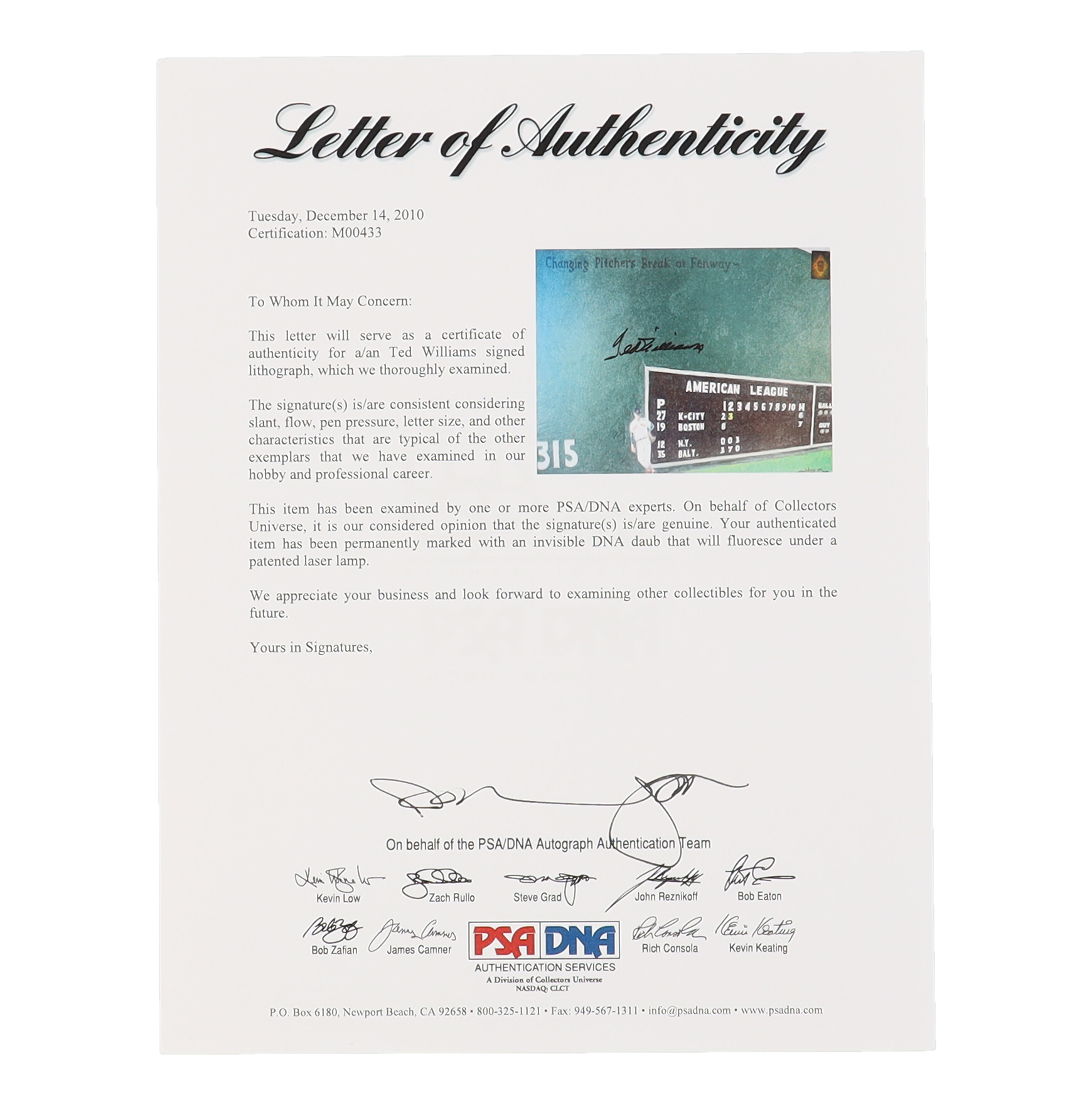 The autograph(s) includes an official PSA/DNA hologram and matching LOA as well as a Ted Williams Green Diamond hologram and COA for authenticity purposes.