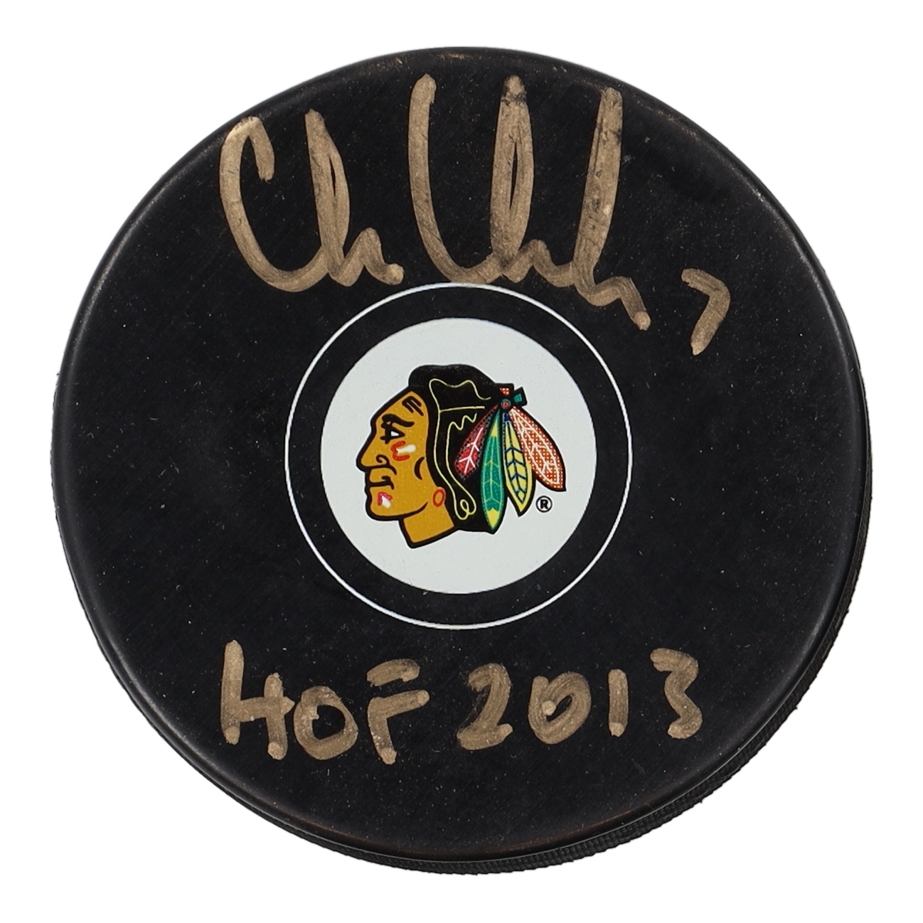Chicago Blackhawks logo hockey puck has been hand-signed and inscribed by Chris Chelios (HOF).