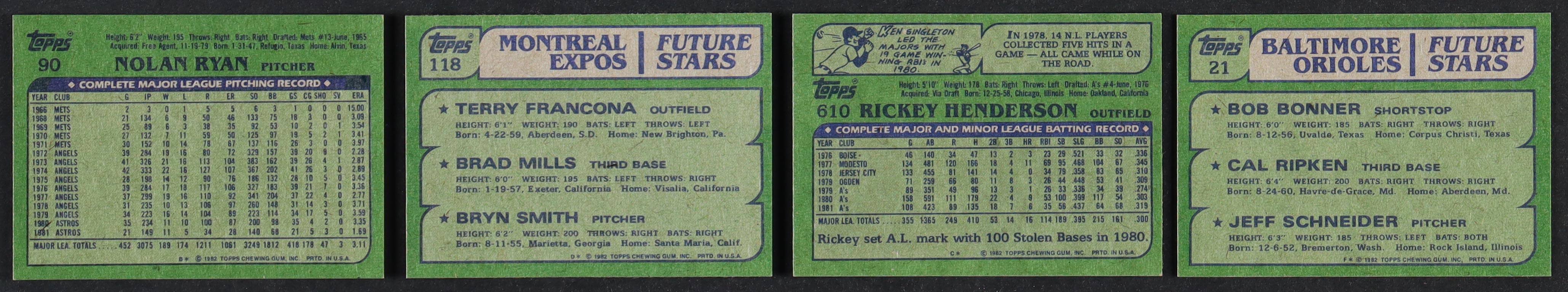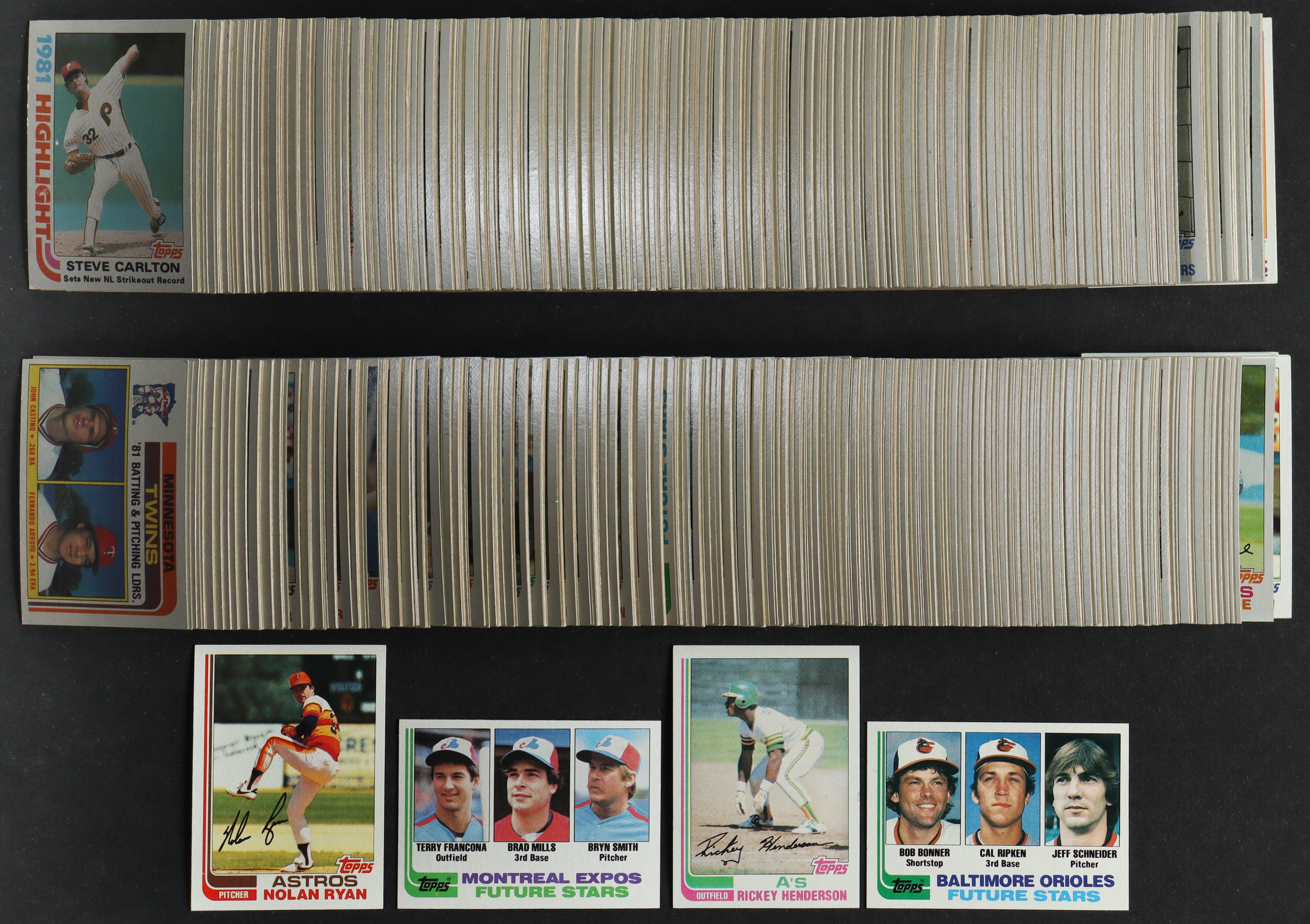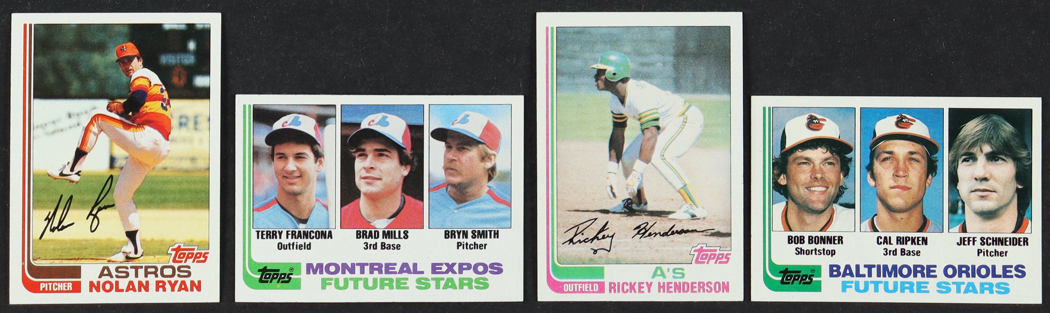 1982 Topps Baseball Complete Set of (792) cards with Bob Bonner RC / Cal Ripken RC / Jeff Schneider RC #21, Nolan Ryan #90, Rickey Henderson #610, Terry Francona / Brad Mills/ Bryn Smith #118