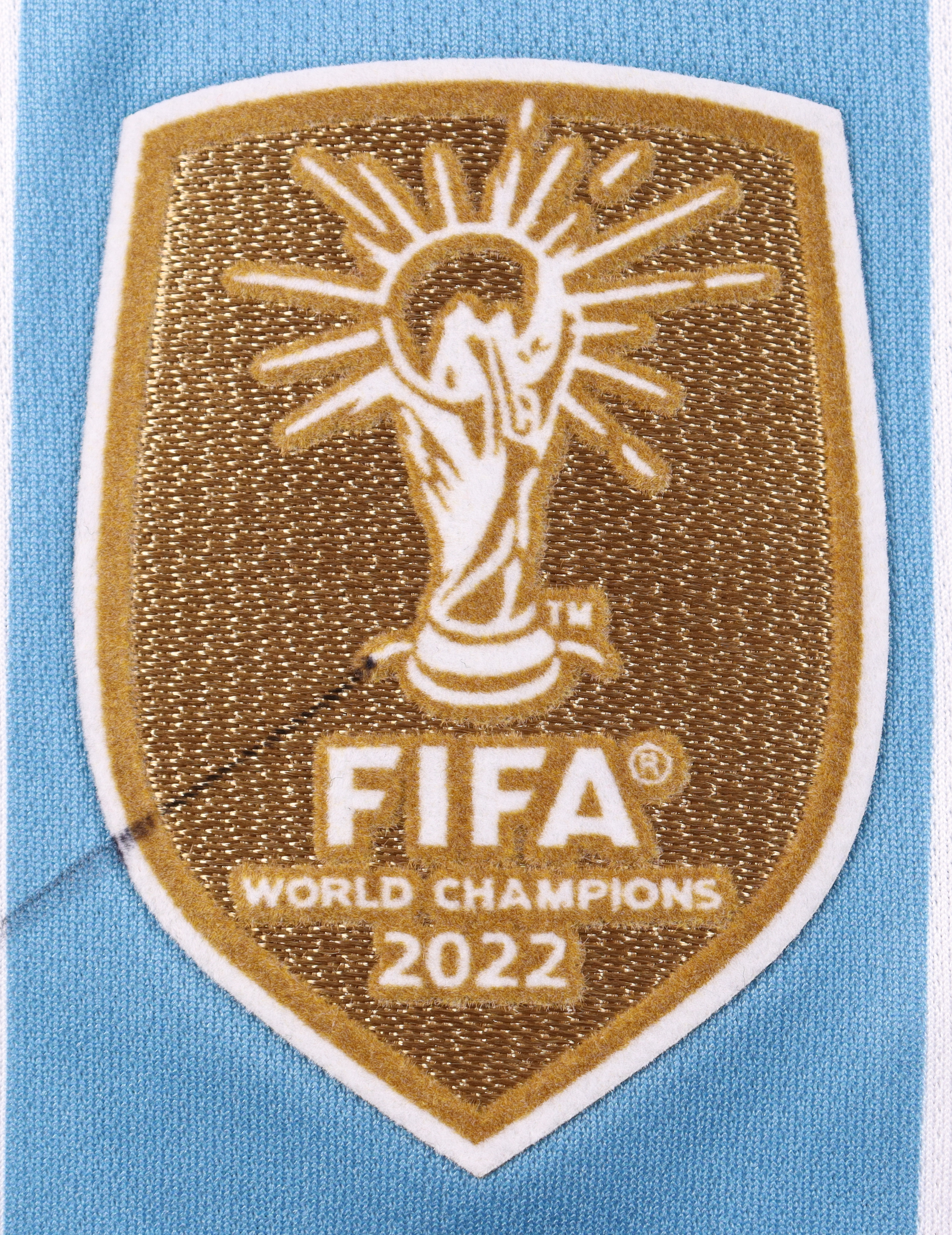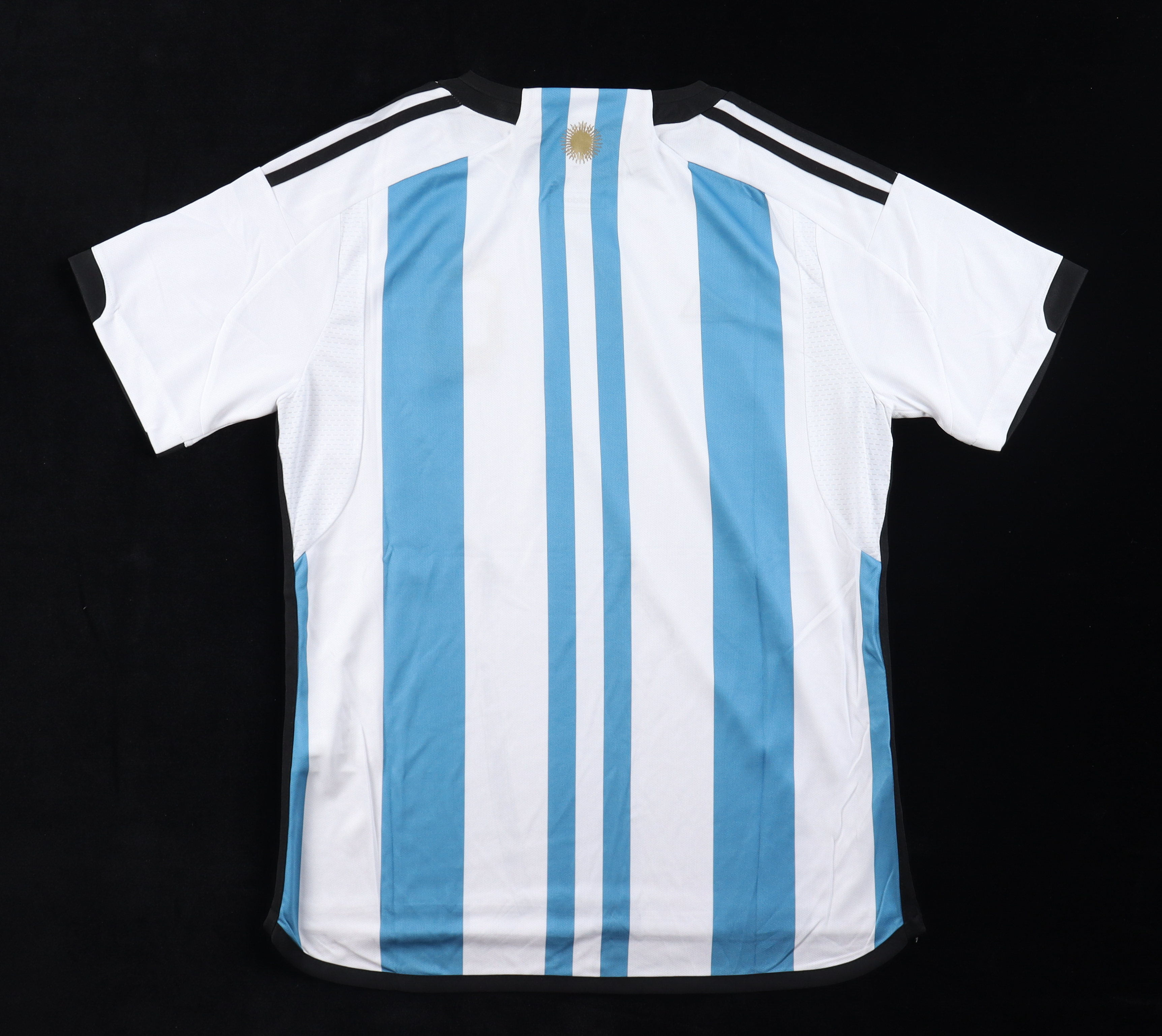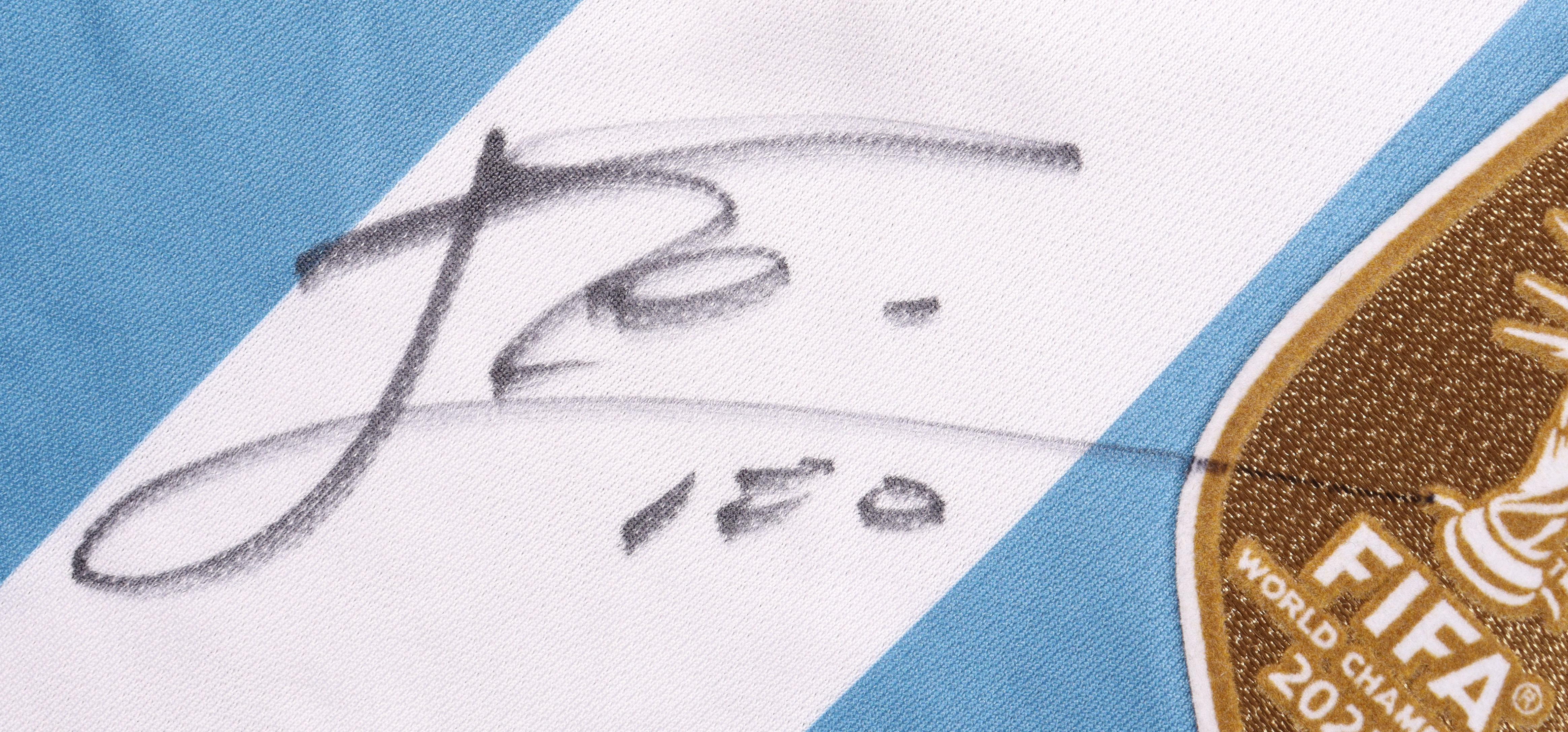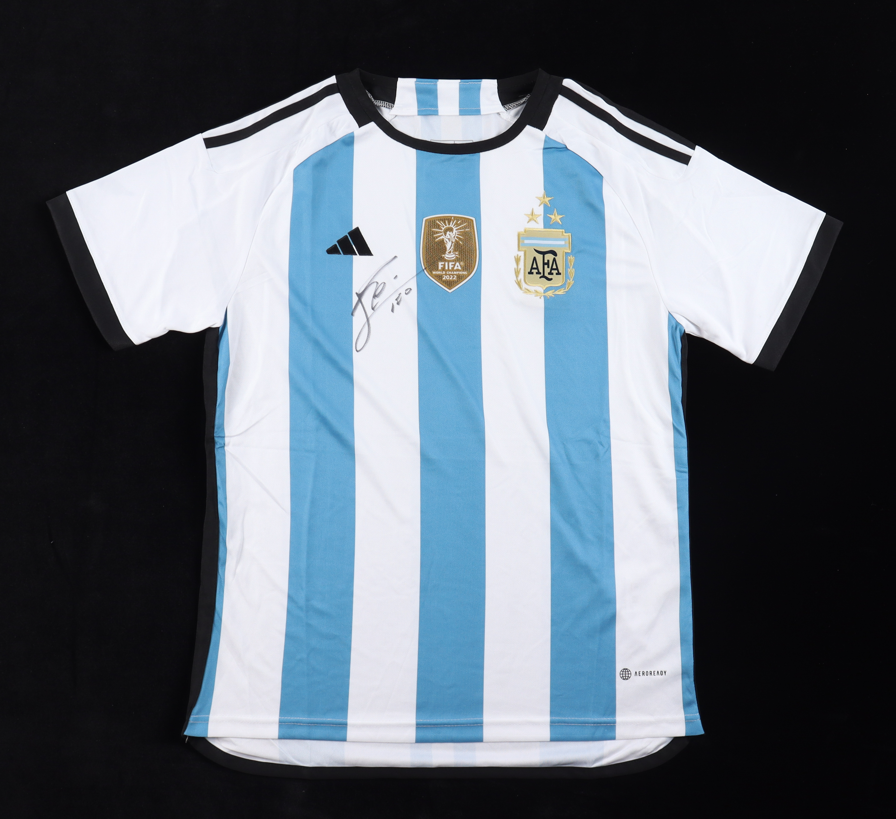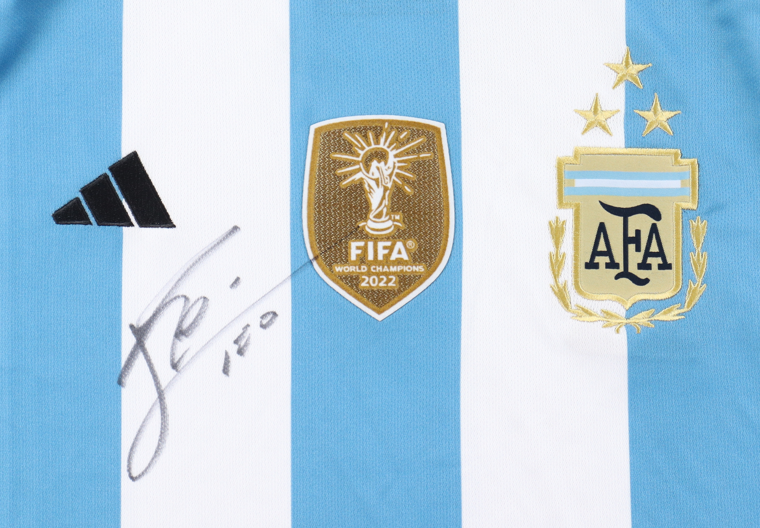 Adidas jersey with everything printed on, size M. Hand-signed and inscribed by Lionel Messi (Team Argentina).