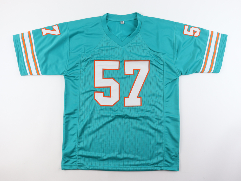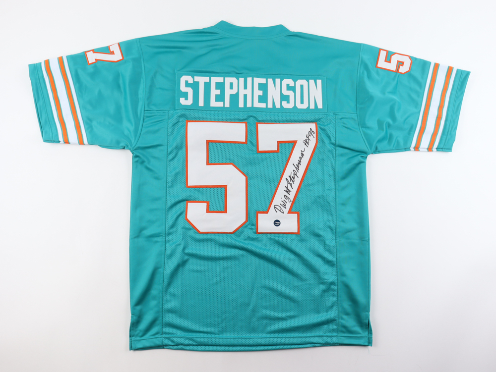 Custom jersey. Everything sewn on, size XL. Hand-signed and inscribed by Dwight Stephenson (HOF).