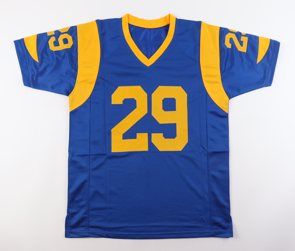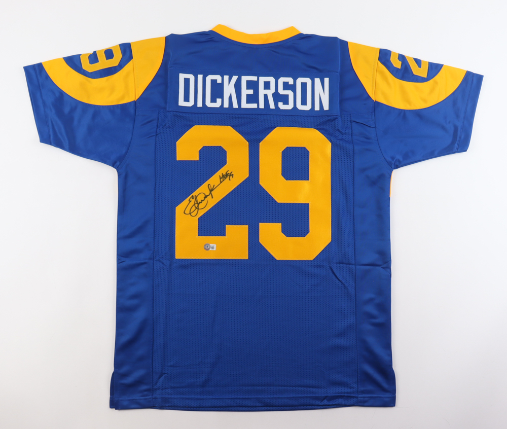 Custom jersey. Everything is sewn on, size XL. Hand-signed and inscribed by Eric Dickerson (HOF). Please note, the signature and inscription have bled.