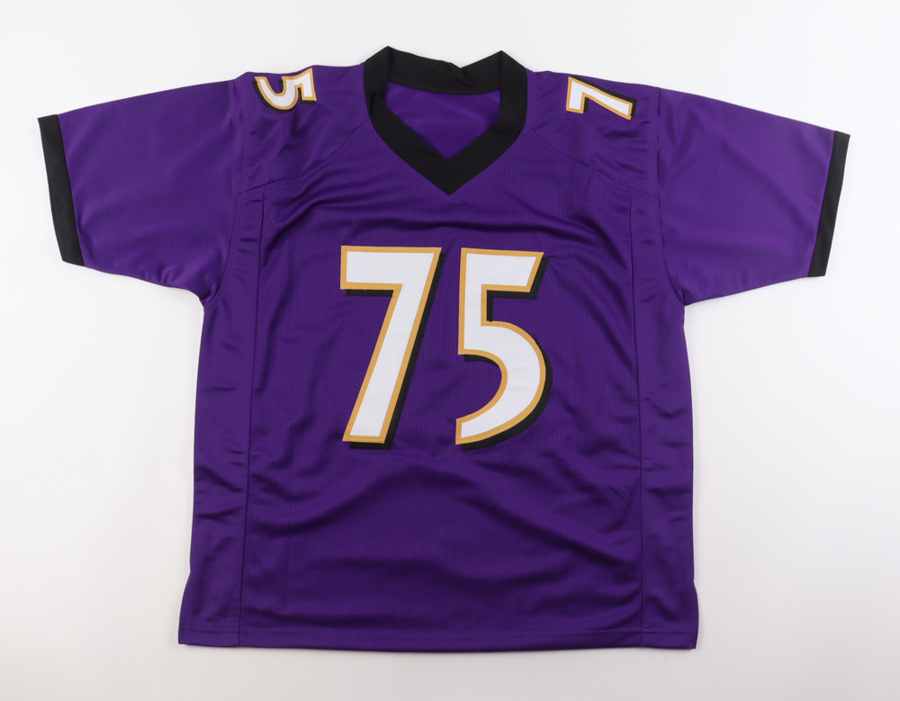Custom jersey. Everything is sewn on, size XL. Hand-signed and inscribed by Jonathan Ogden (HOF).