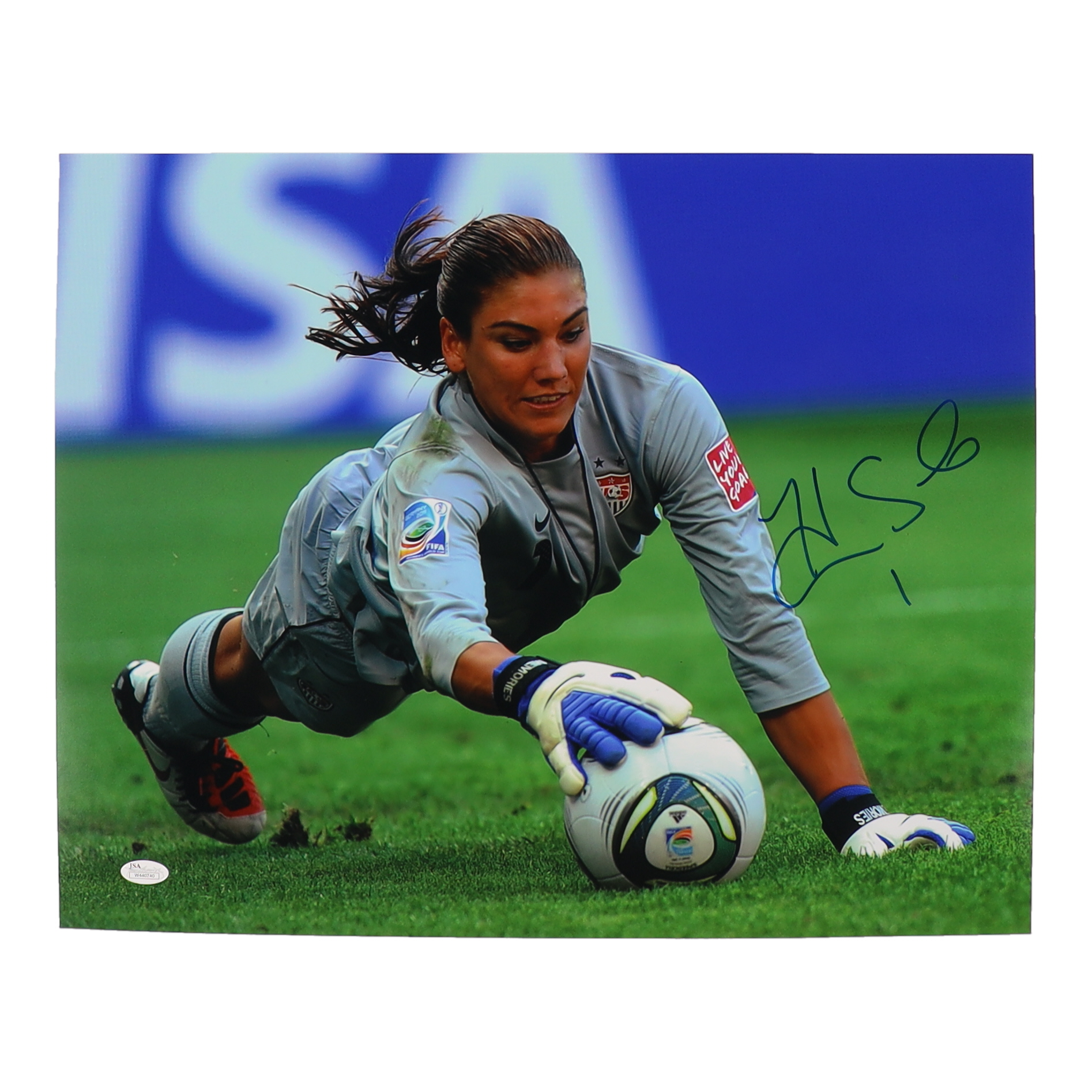Photo measures 16" x 20" in size and has been hand-signed by Hope Solo (Team USA).