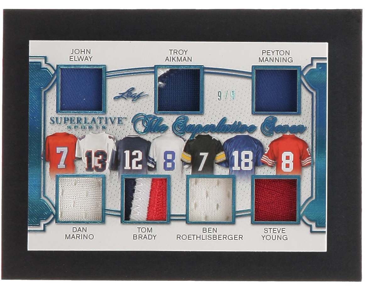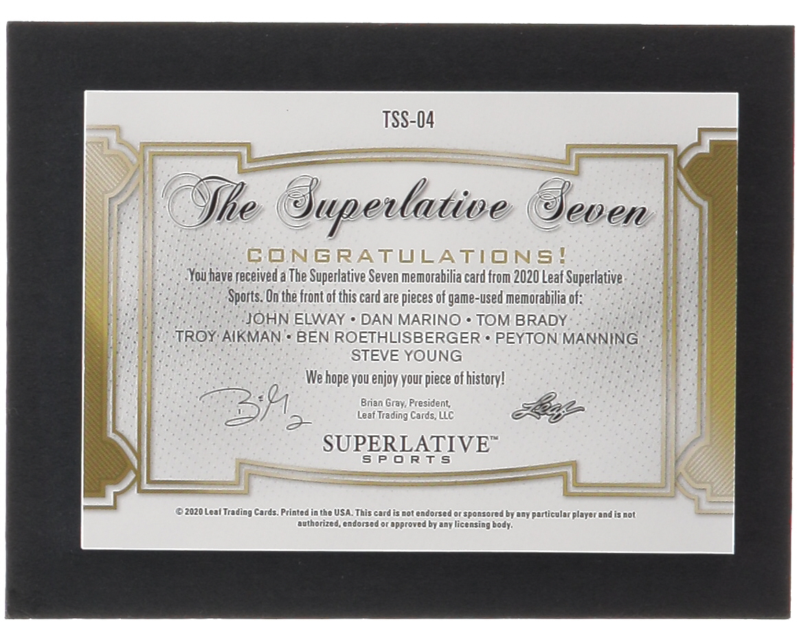 John Elway / Dan Marino / Tom Brady / Troy Aikman / Ben Roethlisberger / Peyton Manning / Steve Young 2020 Leaf Superlative Sports The Superlative 7 Memorabilia Platinum Blue Spectrum #TSS04 #9/9