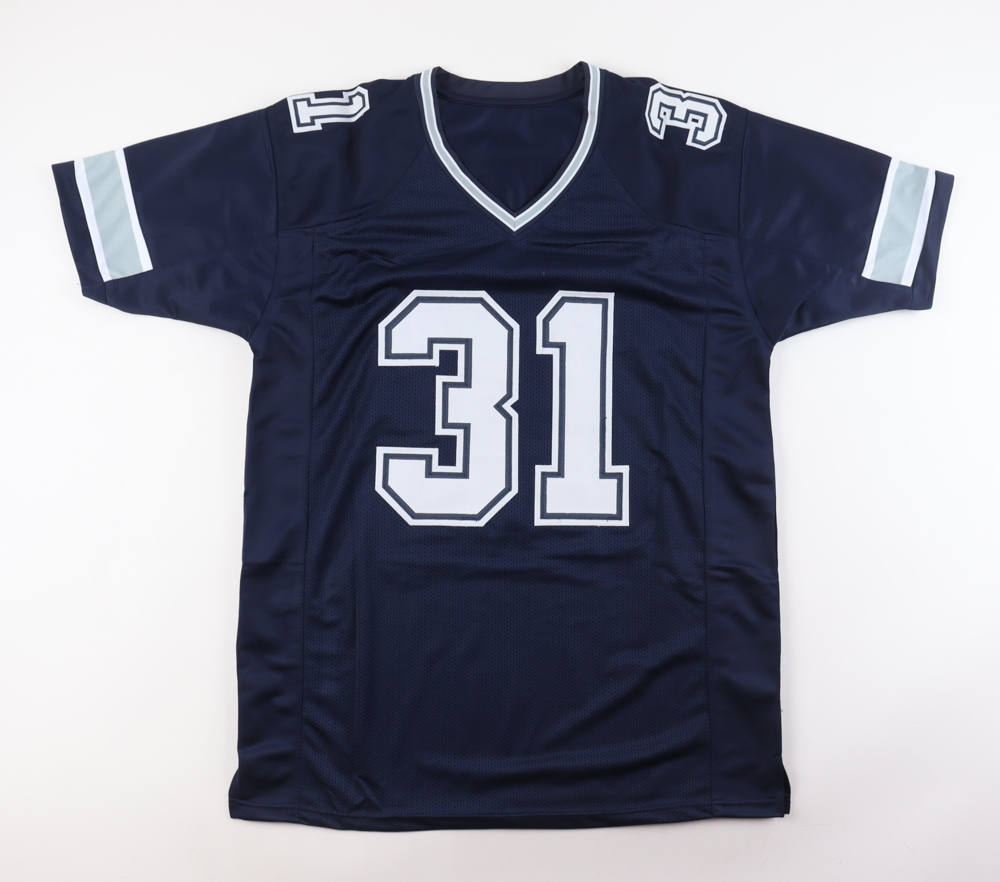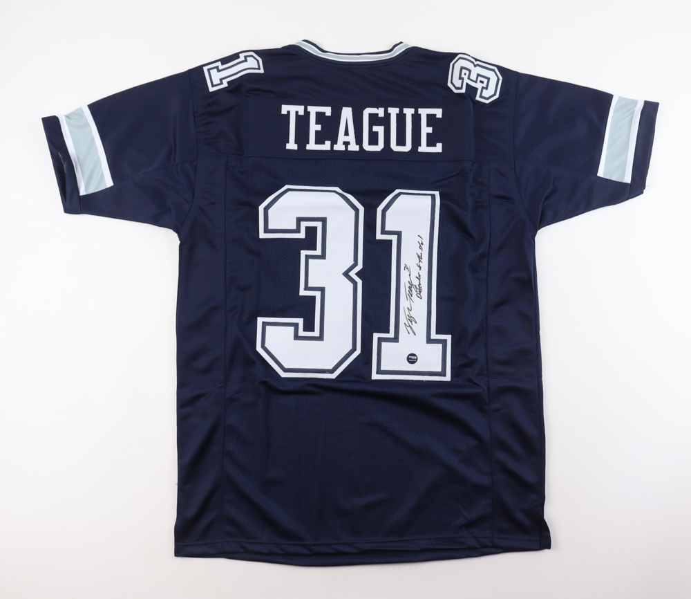 Custom style jersey with everything sewn on, size XL. Hand-signed and inscribed by George Teague. Please note, the inscription has bled.