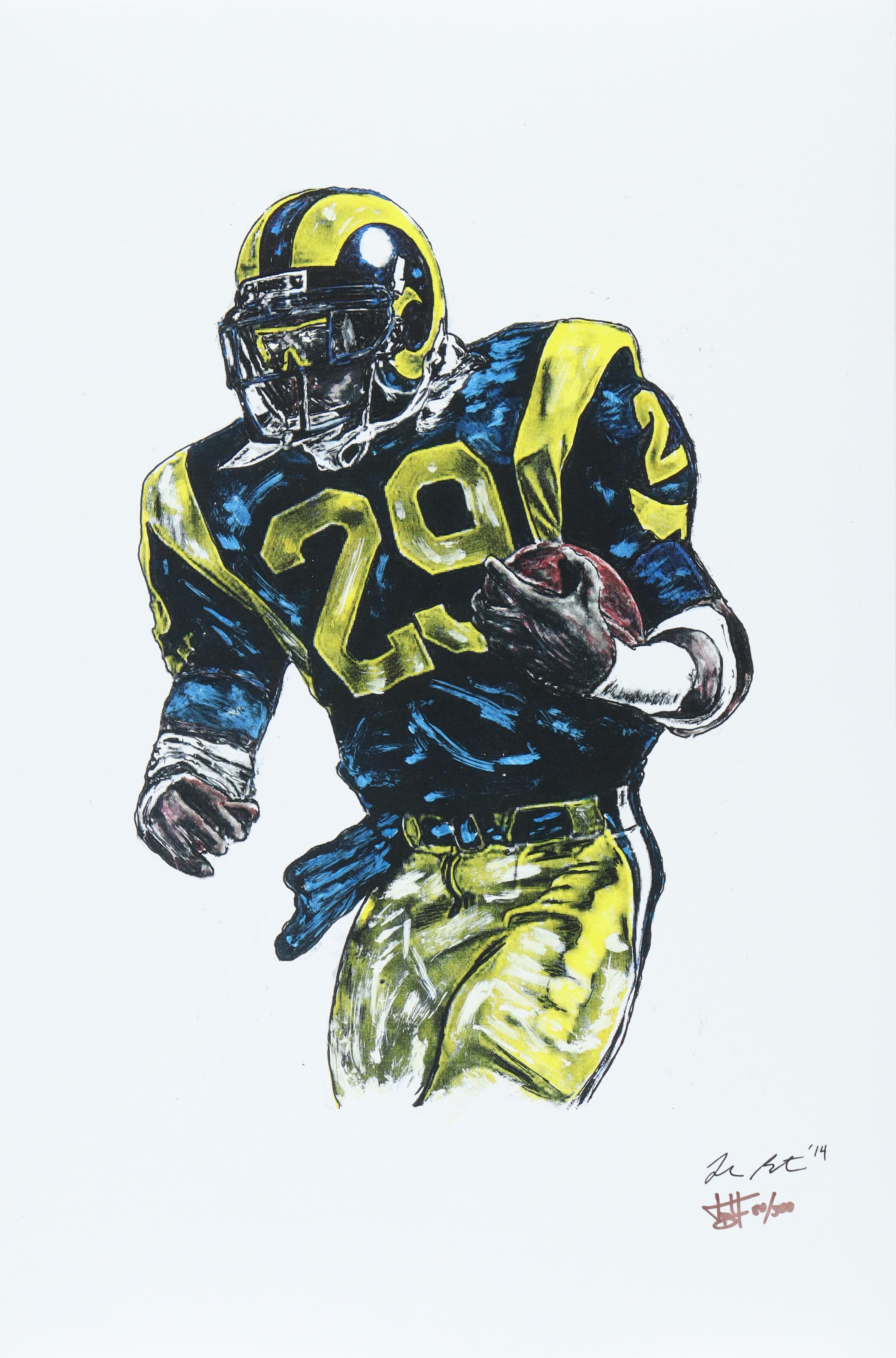 Print measures approximately 12" x 18" in size. The piece is hand-signed and numbered by the artist, Joshua Barton and features Eric Dickerson (Los Angeles Rams).