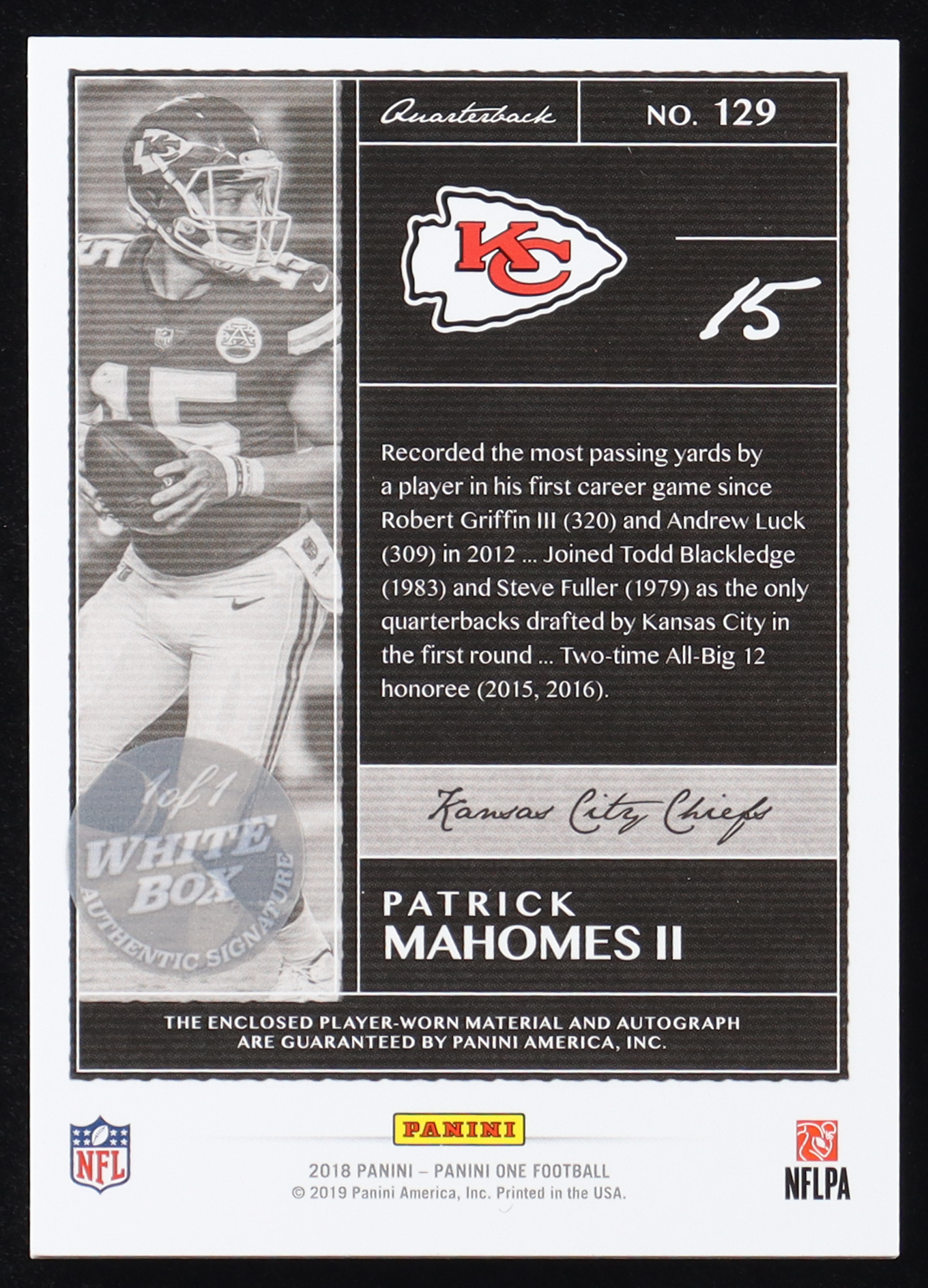 Patrick Mahomes II 2018 Panini One Patch Autographs #129 Nike Logo | White Box #1/1