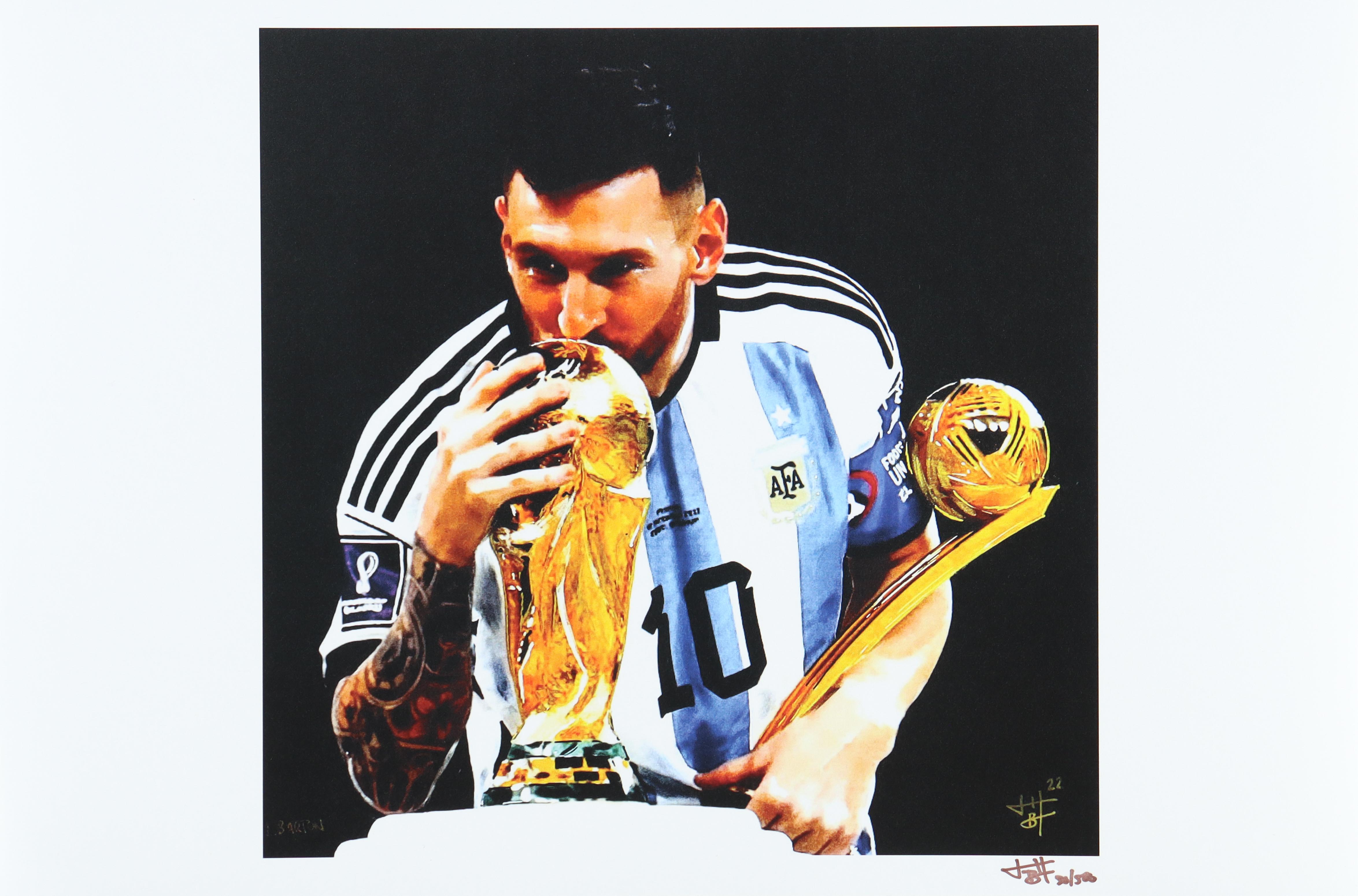 Lithograph measures approximately 12" x 18" in size. The piece is hand-signed and numbered by the artist, Joshua Barton and features Lionel Messi (Argentina).