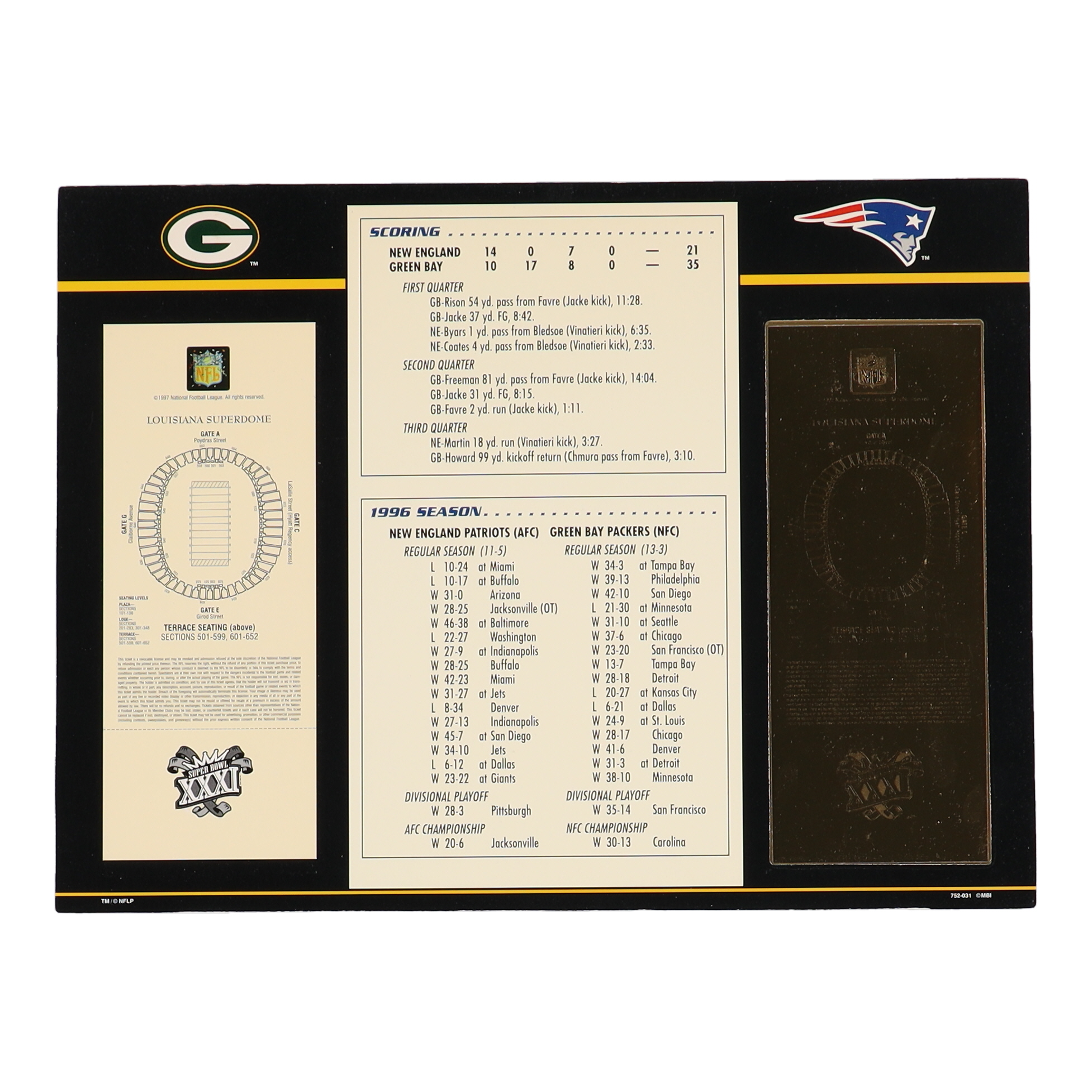 Official scorecard measures 9" x 12" in size with game stats on the reverse side. Features a Green Bay Packers vs New England Patriots replica gold Super Bowl XXXI ticket.