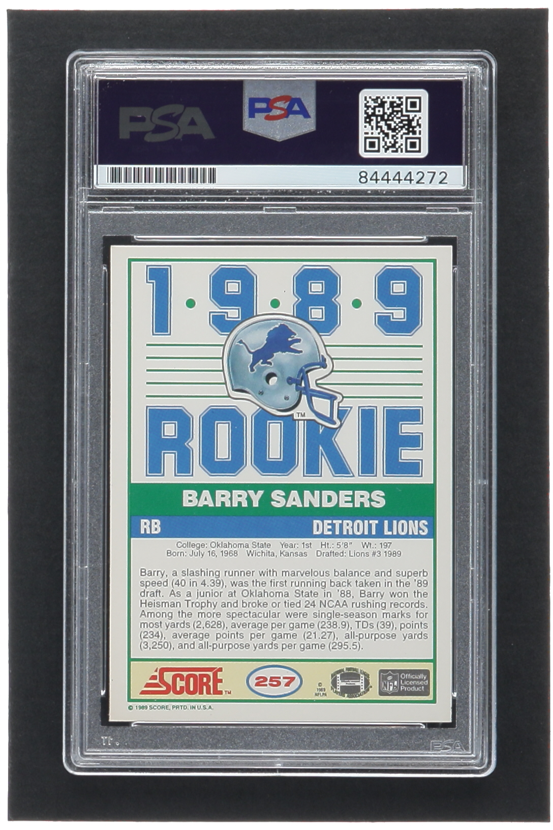 Barry Sanders Signed 1989 Score #257 RC (PSA | Auto 10)