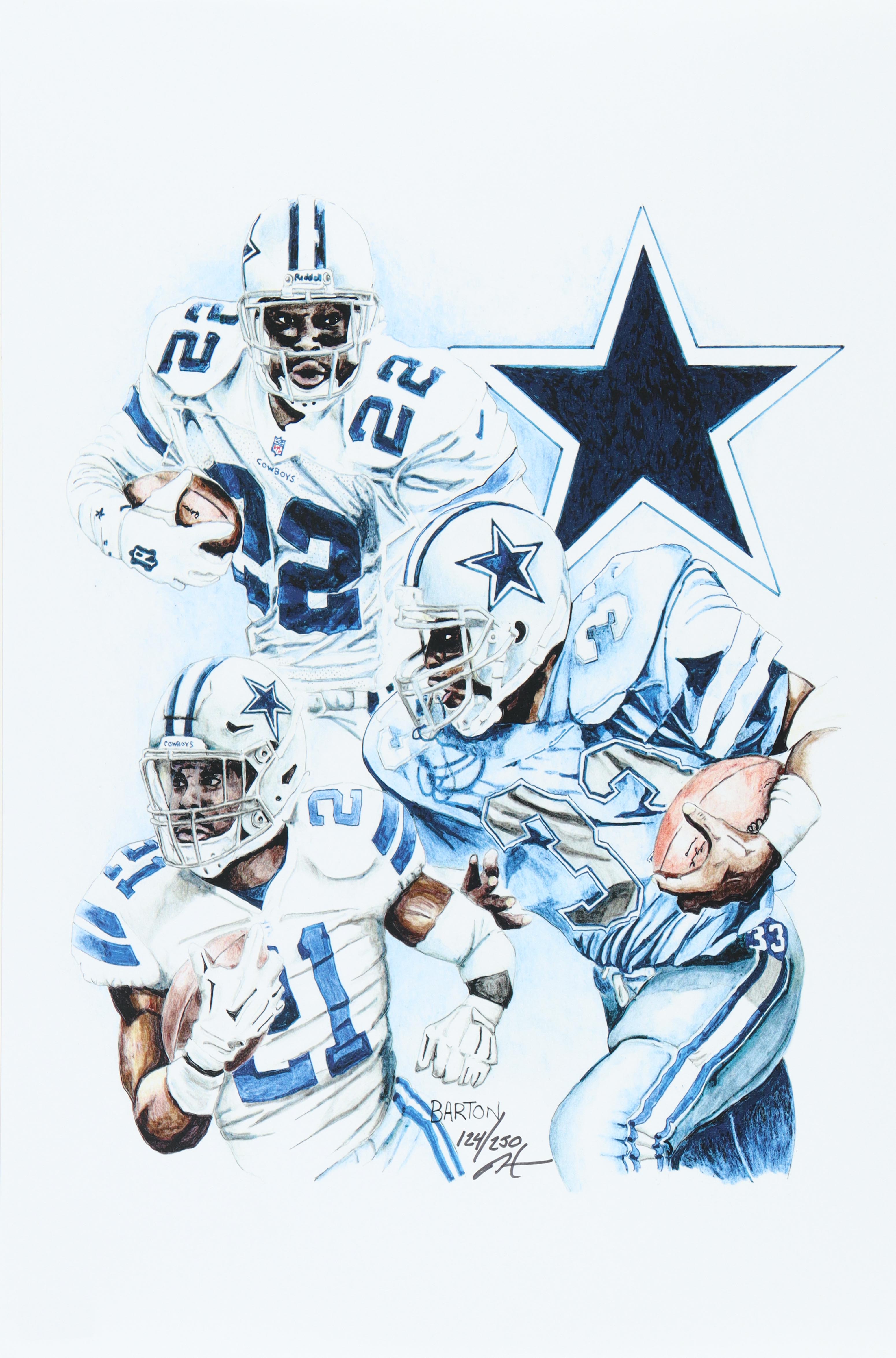 This limited edition giclee on high-quality matte fine art smooth 230gsm paper measures approximately 12" x 18" in size. The piece is hand-signed and numbered by the artist, Brian Barton and features Emmitt Smith (HOF), Ezekiel Elliott and Tony Dorsett (HOF). (Dallas Cowboys).
