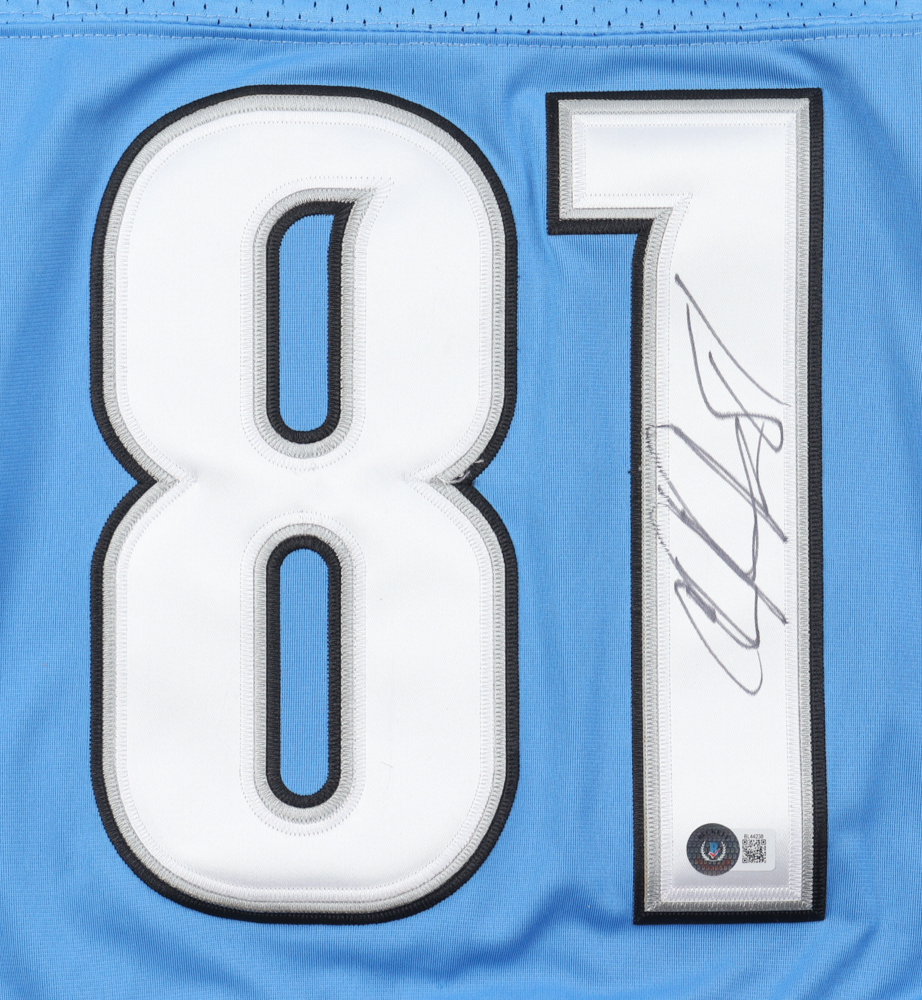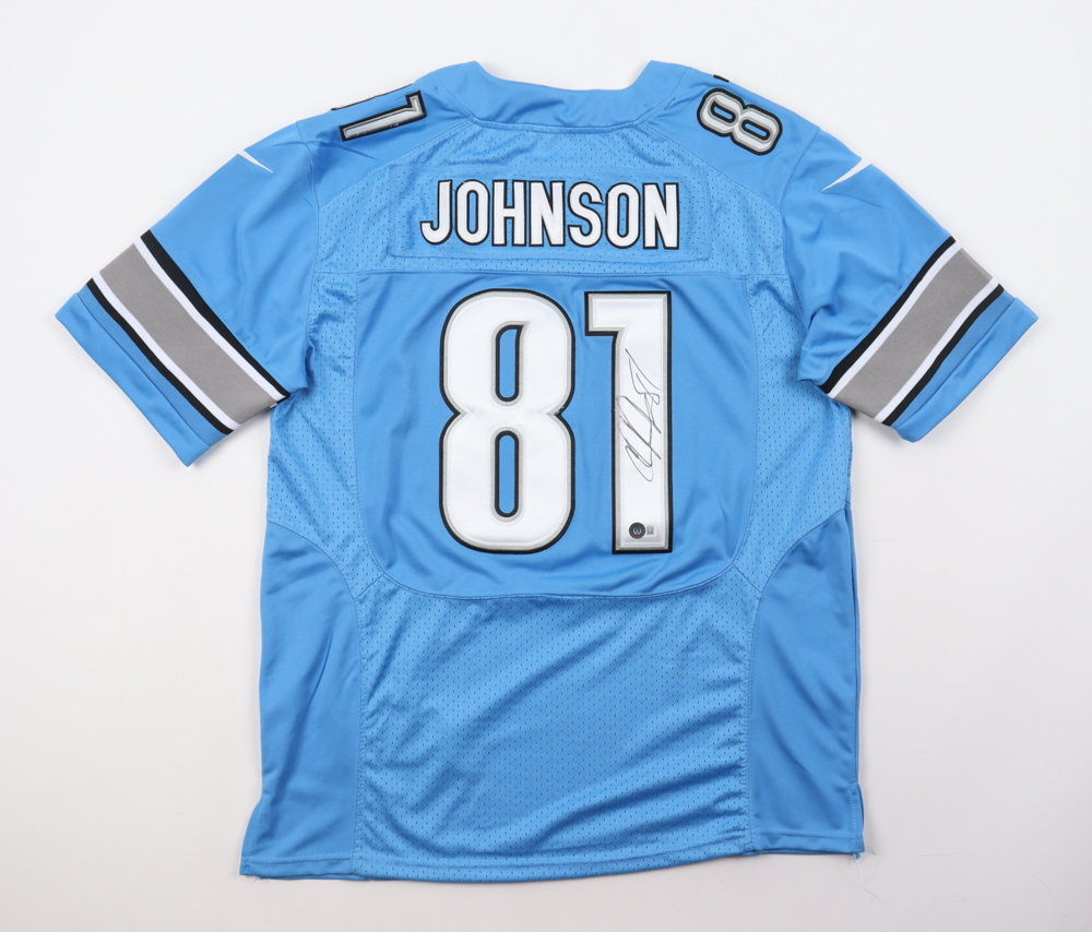 Custom jersey with everything sewn on, size 44. Hand-signed by Calvin Johnson (HOF).