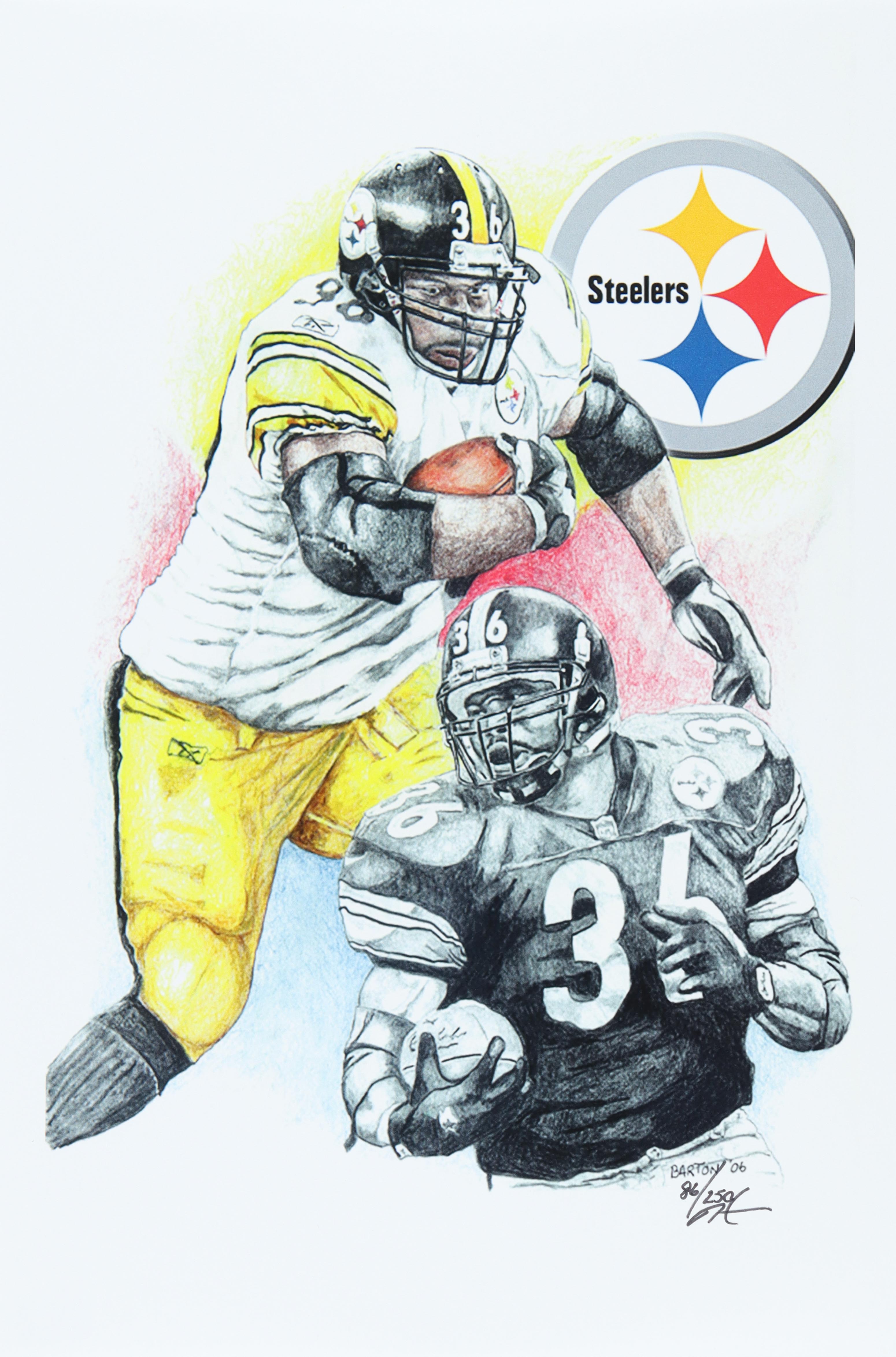 This limited edition giclee on high-quality matte fine art smooth 230gsm paper measures approximately 12" x 18" in size. The piece is hand-signed and numbered by the artist, Brian Barton and features Jerome Bettis (Pittsburgh Steelers, HOF).