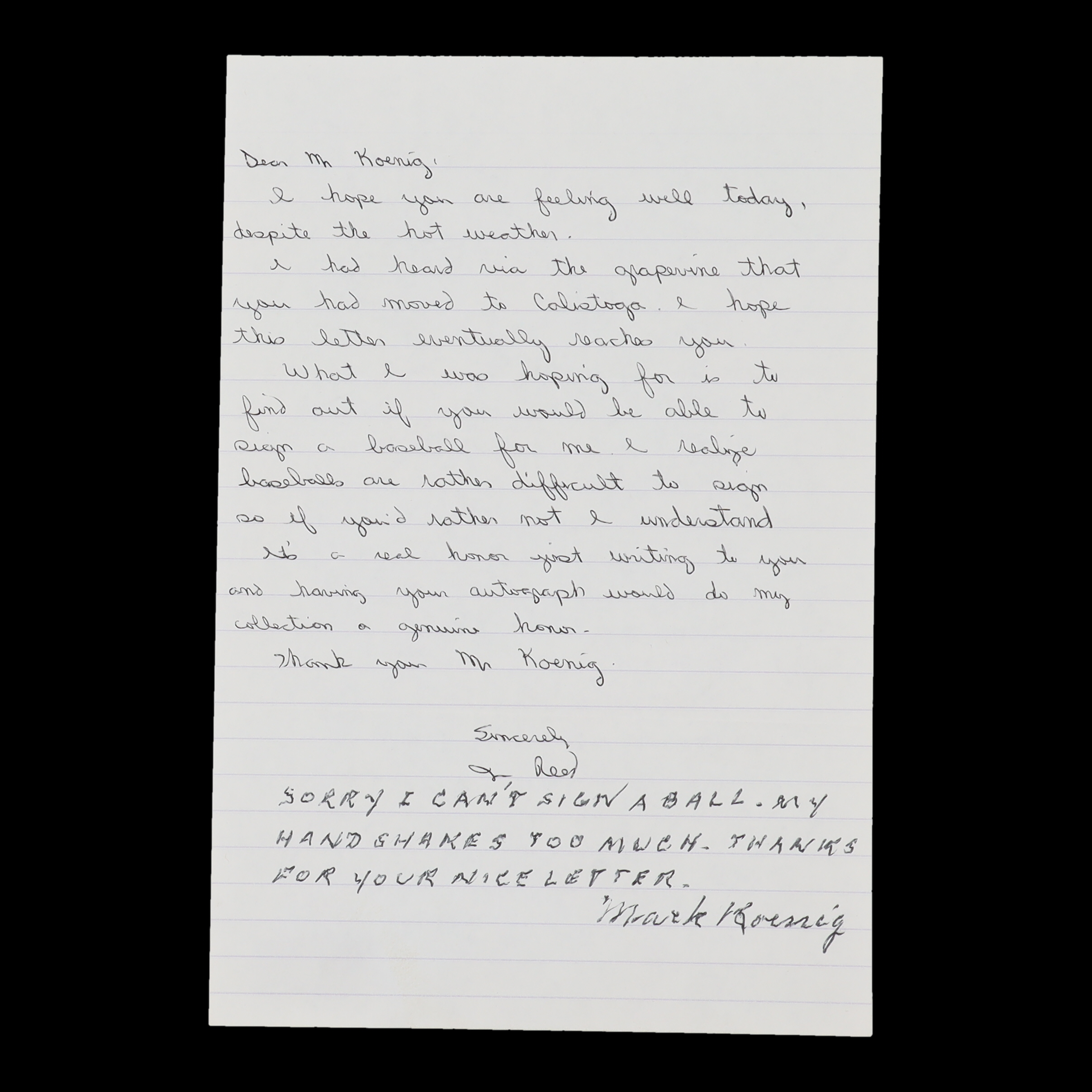 Letter measures 6" x 9" in size. Hand-signed and written by Mark Koenig (D. 1993, New York Yankees). Please note, Koenig's handwriting is the bold print on the bottom of the letter.