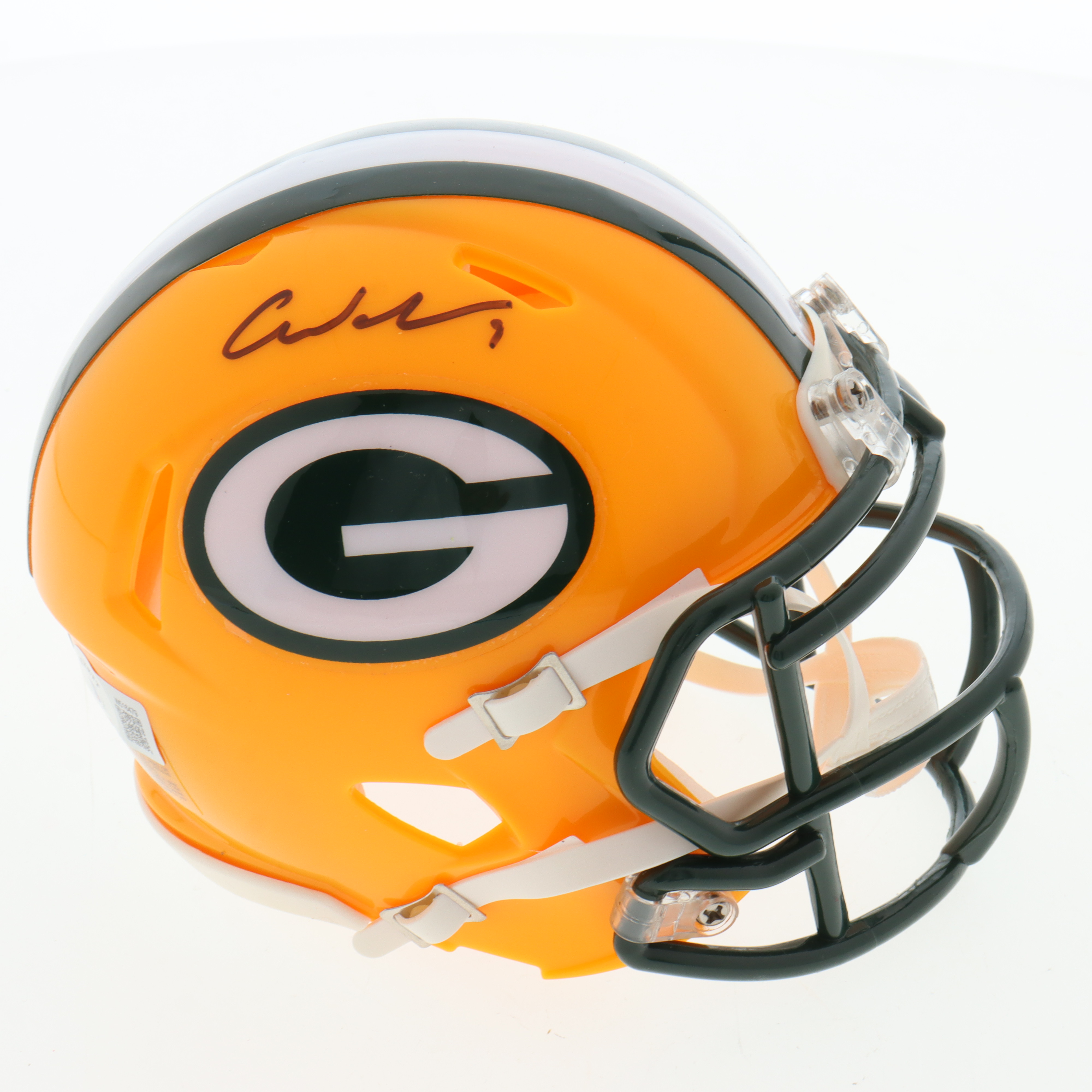 Riddell Green Bay Packers Speed mini helmet. Hand-signed by Christian Watson.
