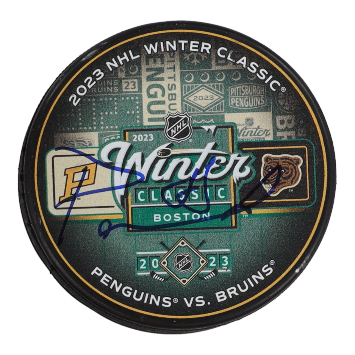 NHL 2023 Winter Classic Logo Hockey Puck. Hand-signed by David Pastrnak (Boston Bruins).